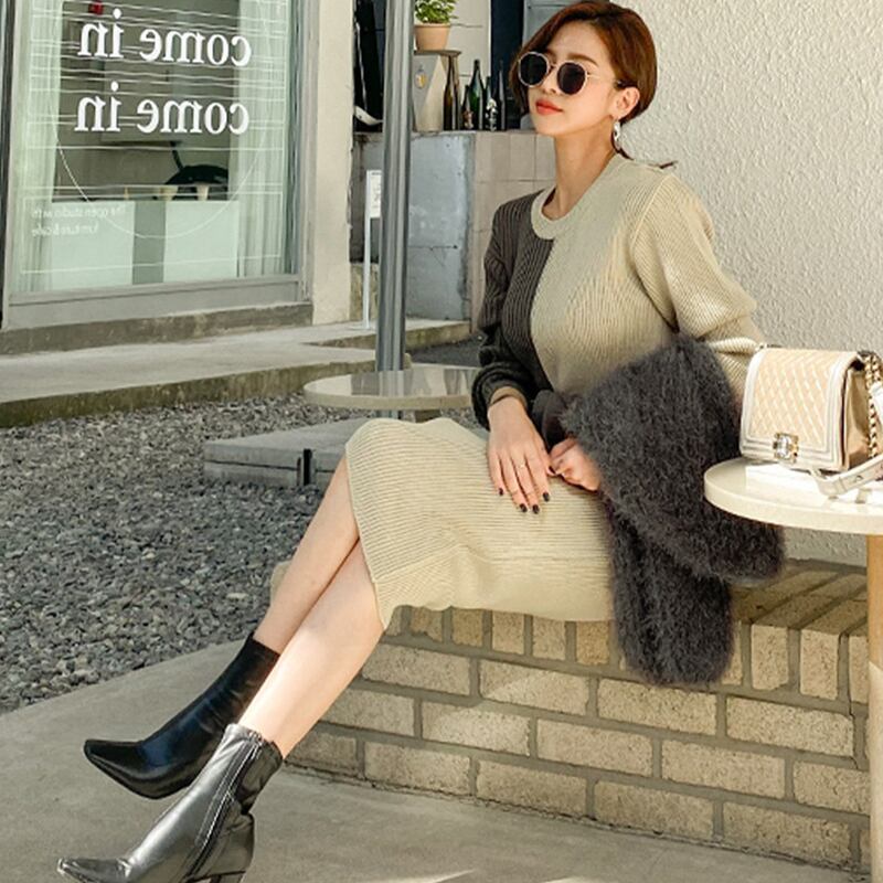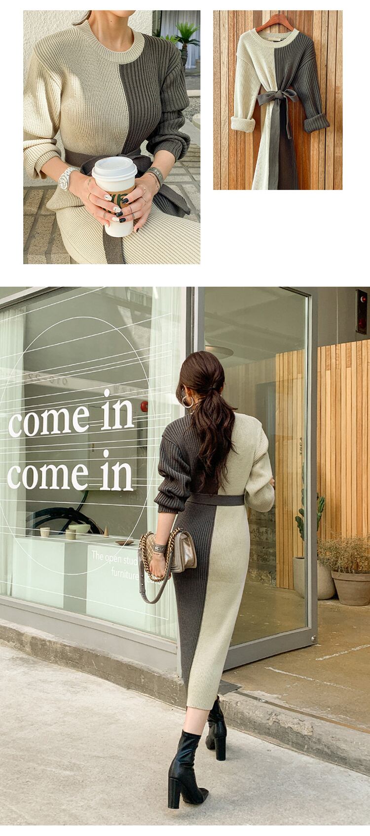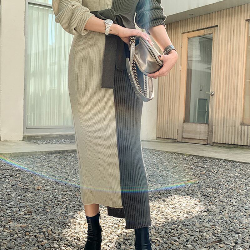 新着ファッションボディコンドレス気質 o ネックステッチスリム非対称ミディドレスレディースニットワイルドドレス Oネック