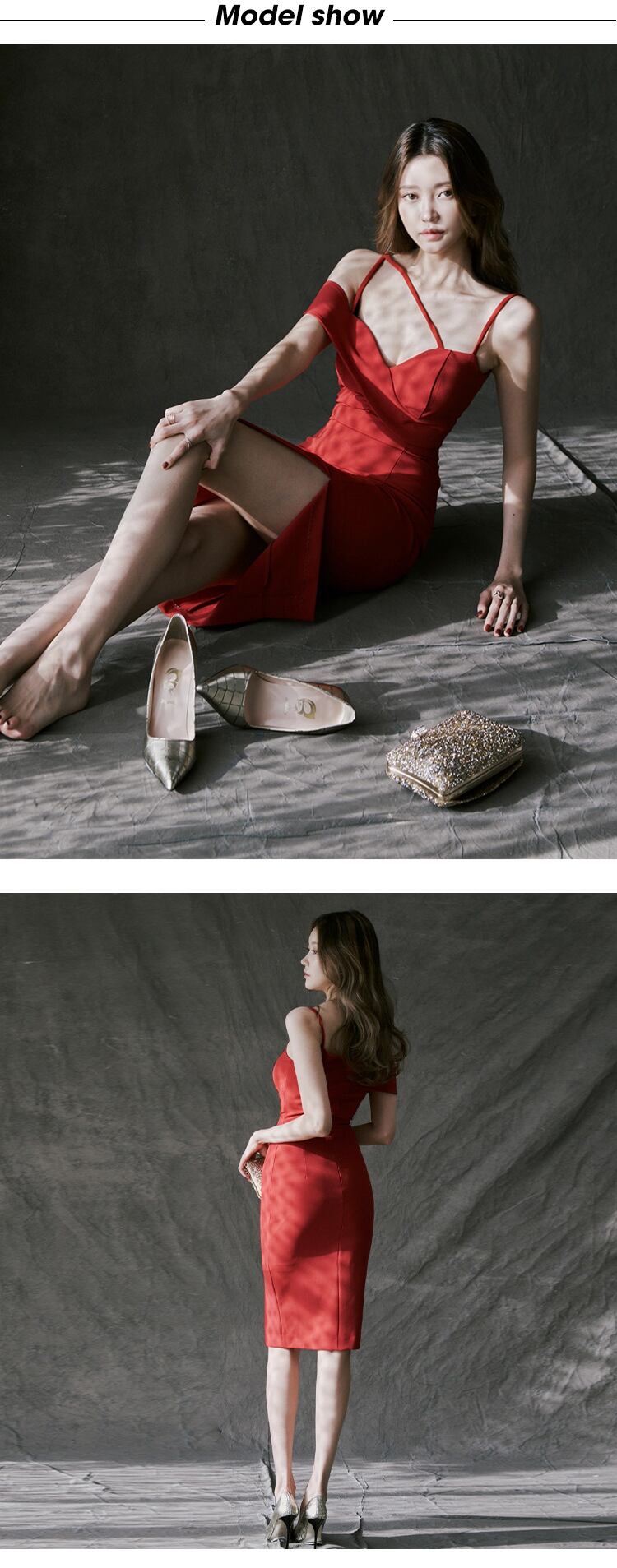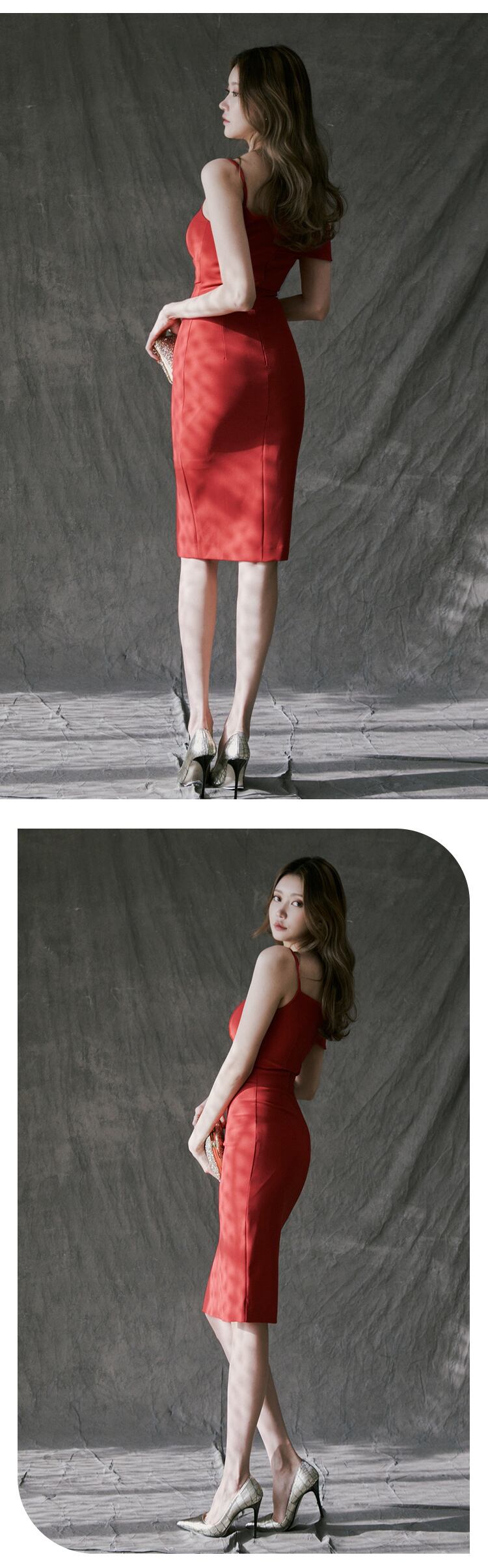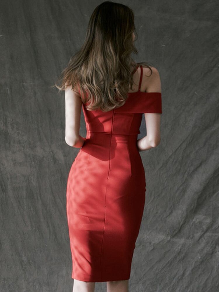 新着ファッション韓国夏ミディ パーティー ドレス OL 気質セクシーオフショルダー ストラップ赤スリム スプリット ペンシル ドレス レッド サマー 夏物