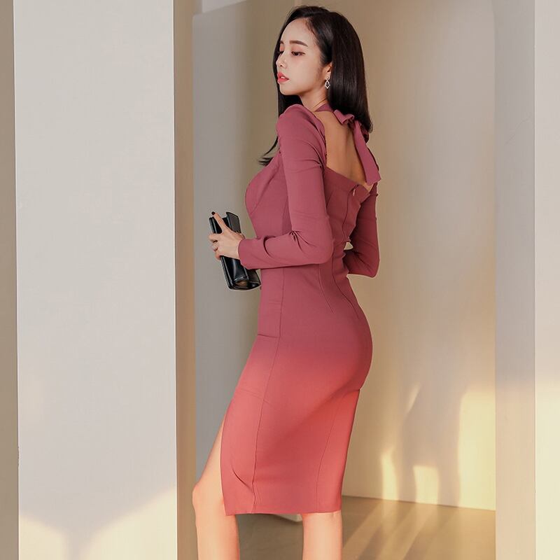 新着ファッション春スプリット ドレス OL プロフェッショナル気質スクエア ネック ローカット セクシー ホルター ネック スリム ペンシル ドレス スプリング 春物 スクウェア