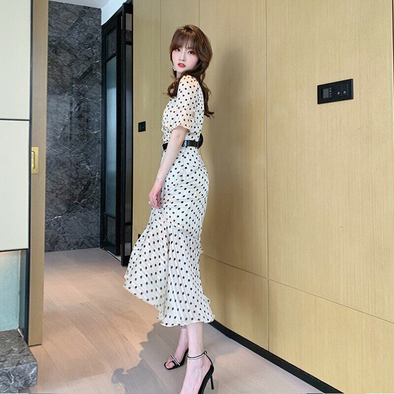 新着韓国スタイルファッションドレスエレガント夏 OL レディヴィンテージドット気質フレアスリーブスリム非対称ドレス サマー 夏物 ビンテージ