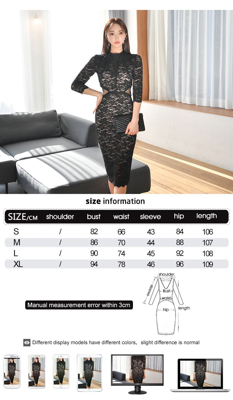 新着ファッション韓国春ミディ パーティー ドレス OL 気質セクシー視点レース背中開いたスリム スプリット ペンシル ドレス スプリング 春物