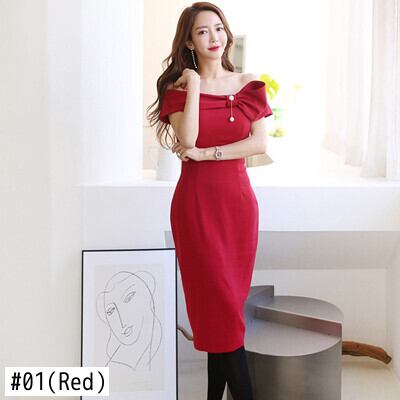 新着ファッション韓国夏ミディ パーティー ドレス OL プロフェッショナル気質セクシーオフショルダー弓パール スリム ドレス リボン サマー 夏物 真珠