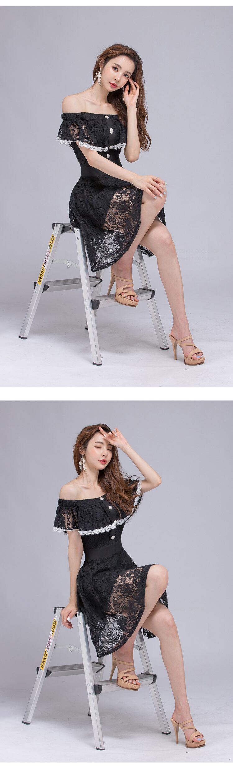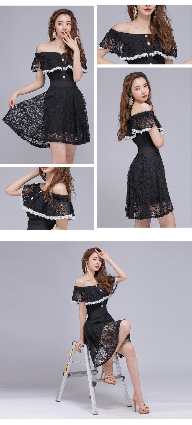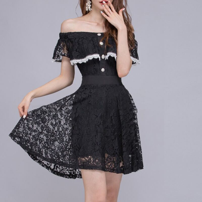 新着ファッション パーティー ナイト クラブ ドレスエレガント夏セクシーオフショルダー気質 OL レース黒スリム a ライン ドレス ブラック サマー 夏物 Aライン
