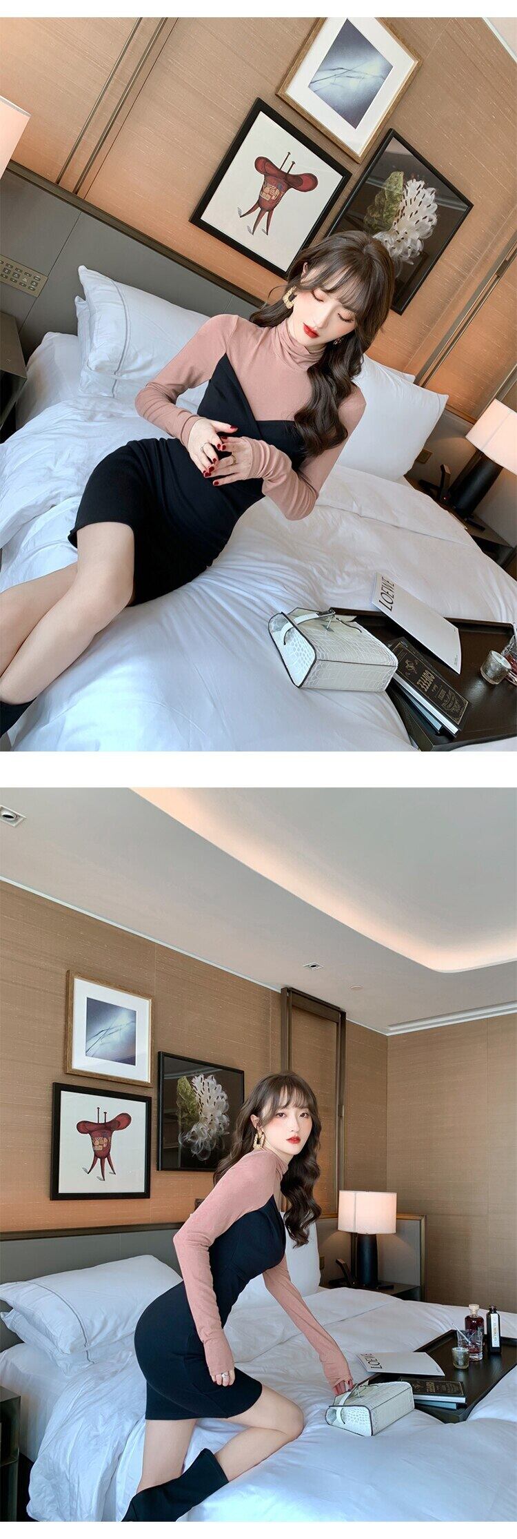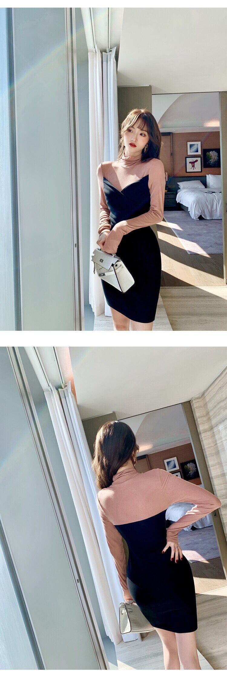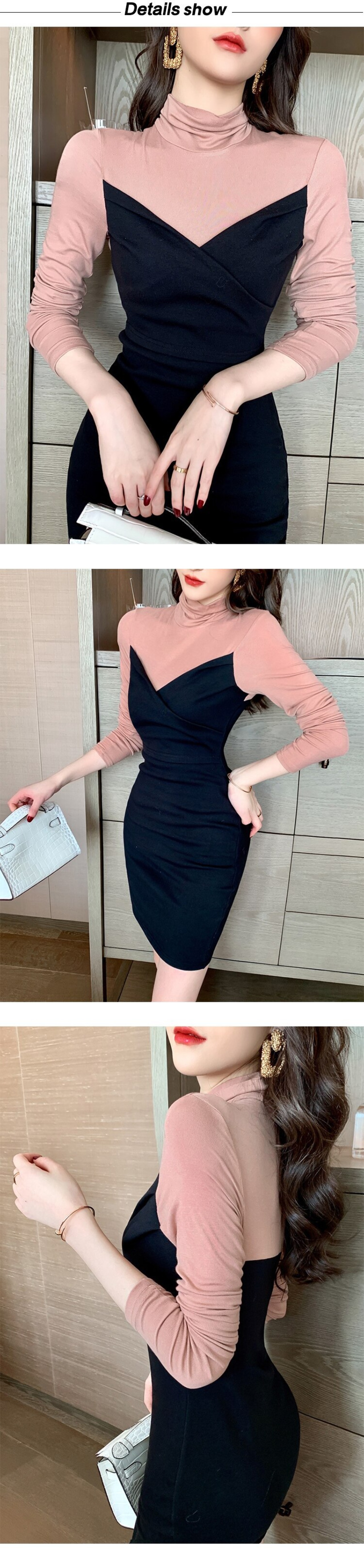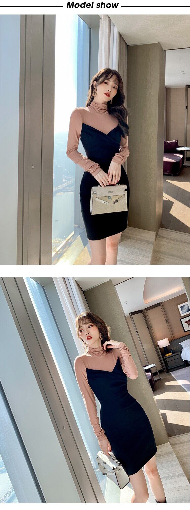 新着ファッション韓国春ミニドレス OL プロ気質ピンクと黒ステッチシンプルスリムペンシルドレス ブラック スプリング 春物
