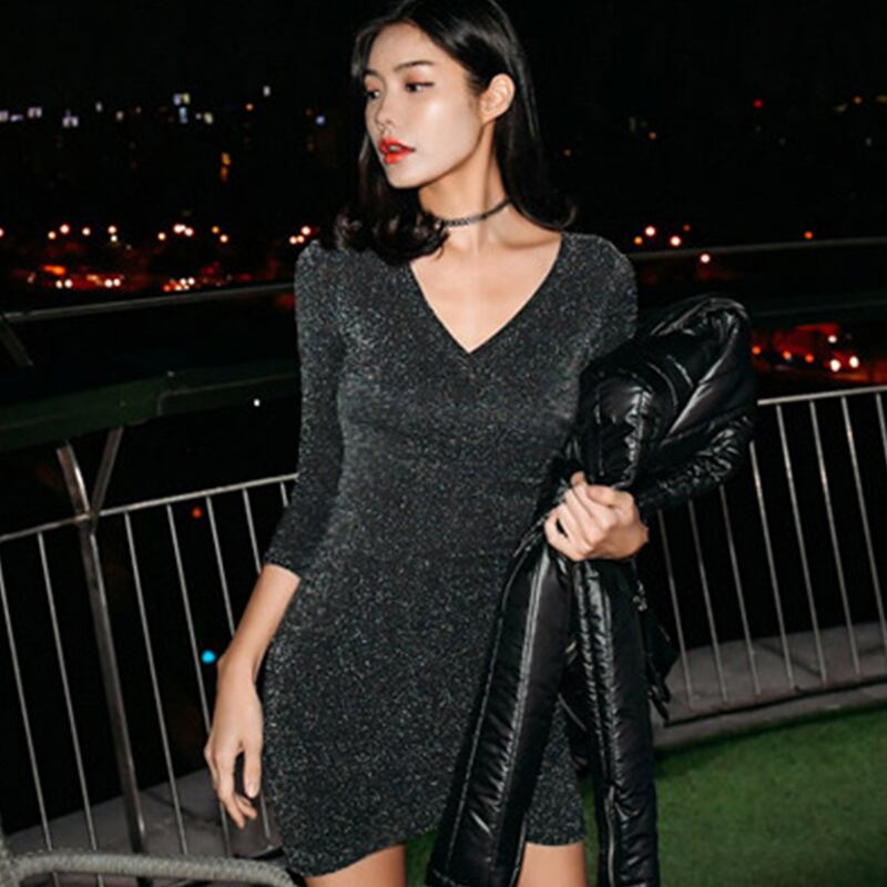 ファッション新着comtableシャイニングベーシックパーティードレス気質vネックスリムセクシーヴィンテージエレガントミニペンシルドレス ビンテージ