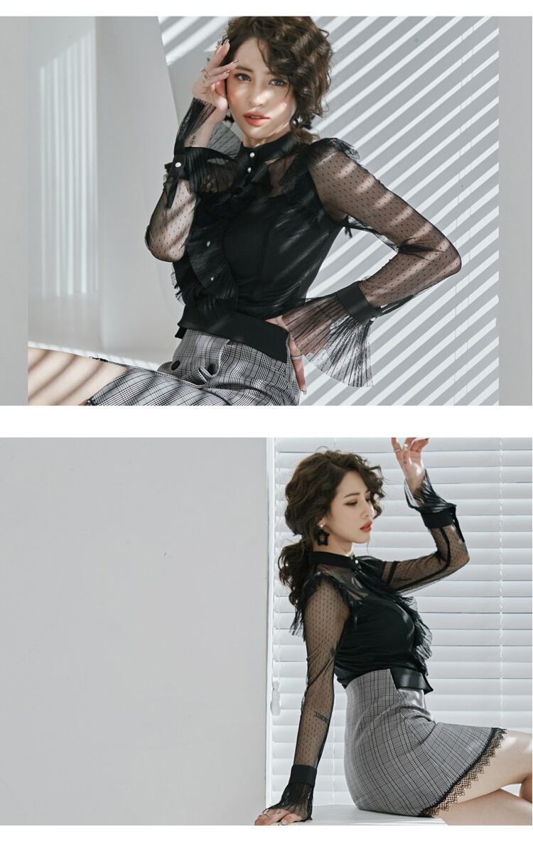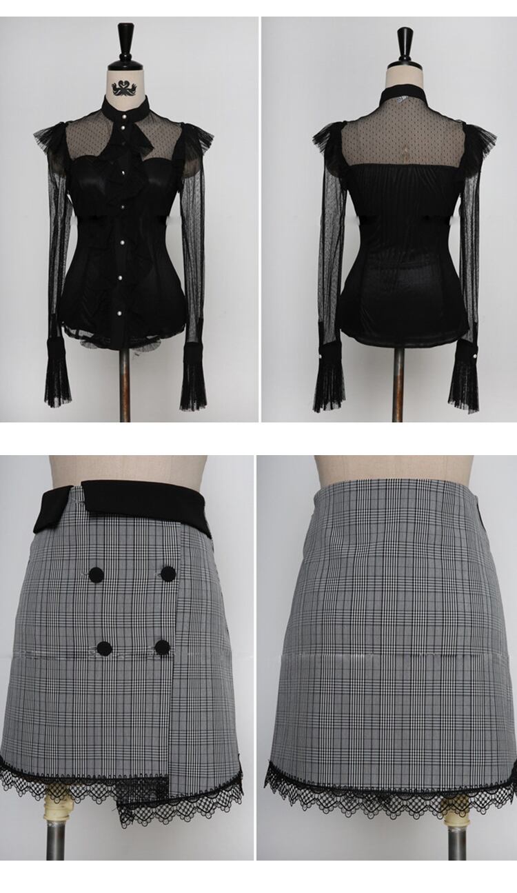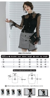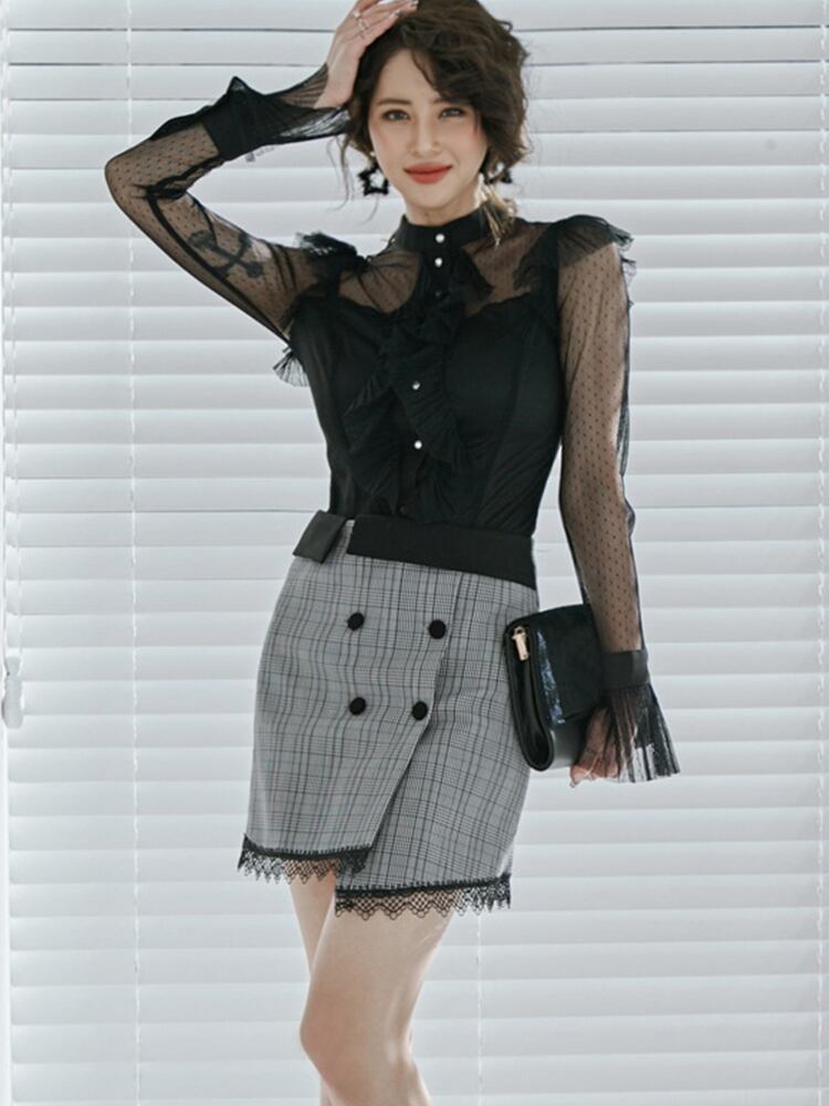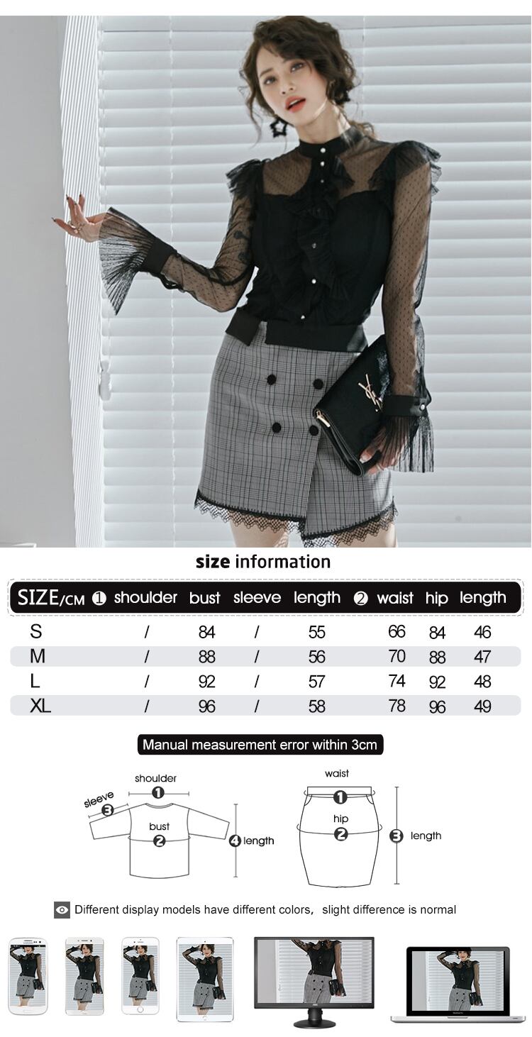 新着ファッションセット春OL気質セクシー視点メッシュドットフリルシャツとチェック柄ミニスカート2点セット スプリング 春物