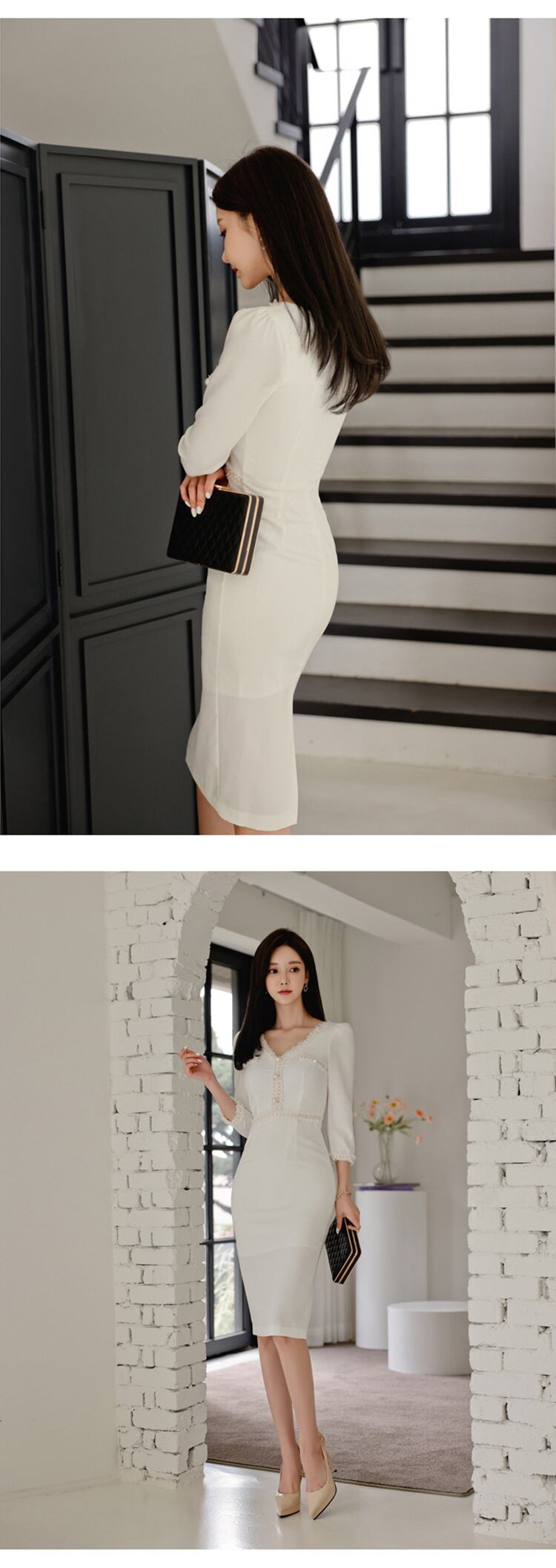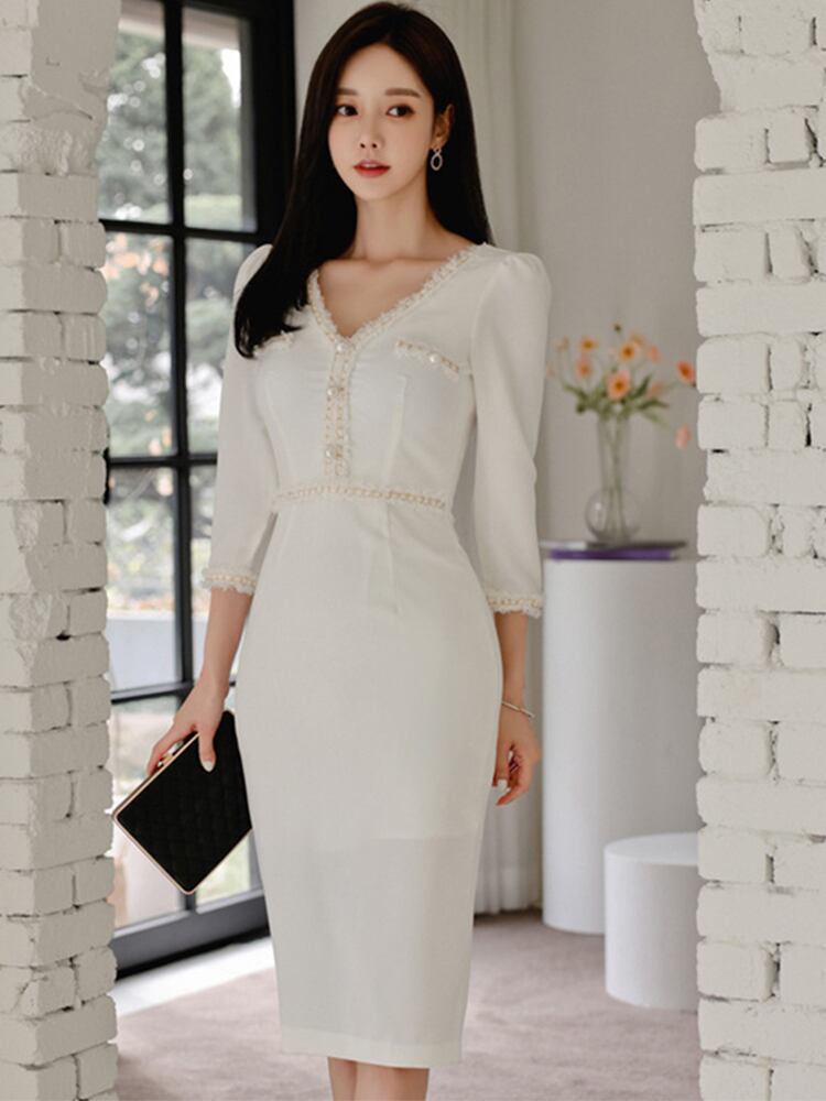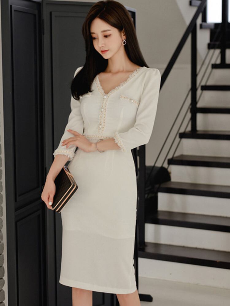 新着ファッションエレガントパールペンシルドレス韓国スタイルvネックハイウエスト気質オフィスレディスリムホワイトドレス ハイウェスト 真珠 会社 学校 通勤や通学にも