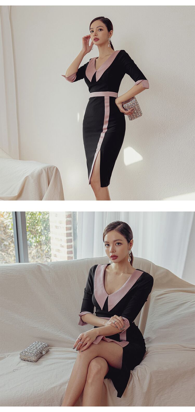 新着ファッション春パーティーミディドレス OL 気質 v ネック黒とピンクパッチワークスリムスプリットペンシルドレス ブラック スプリング 春物 Vネック