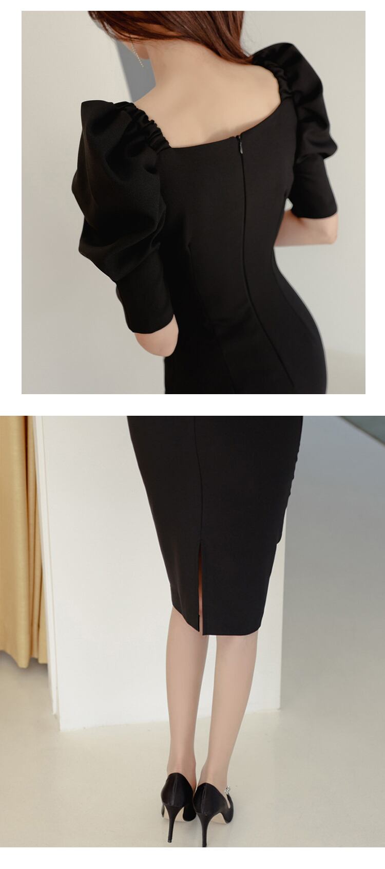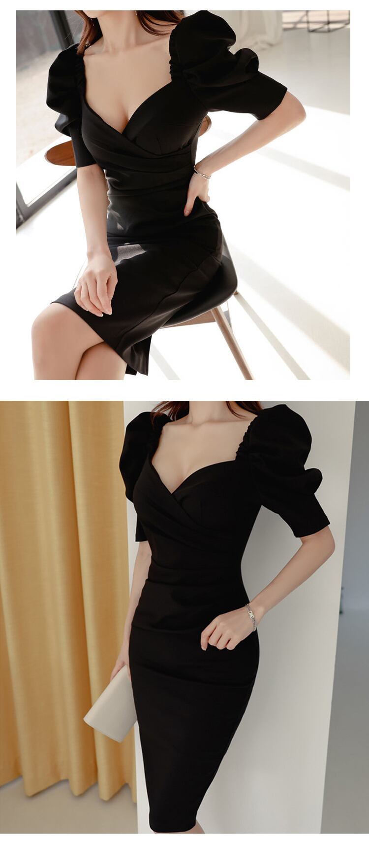 新着ファッション春ミディパーティードレス OL 気質セクシーローカット V ネックヴィンテージパフスリーブブラックスリムペンシルドレス スプリング 春物 Vネック ビンテージ