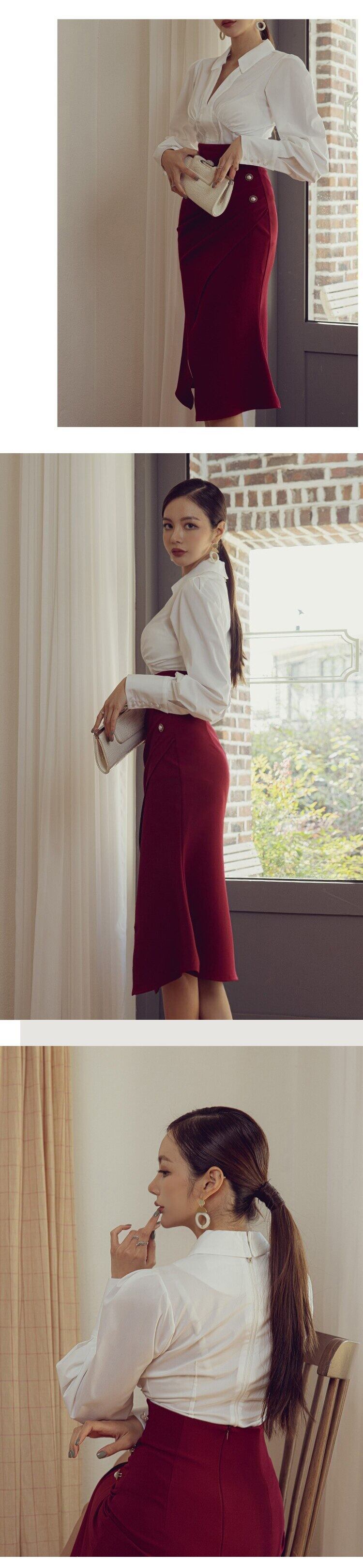 新着ファッション春セット OL プロフェッショナル気質ランタンスリーブシャツと非対称スプリットスカート 2 点セット スプリング 春物