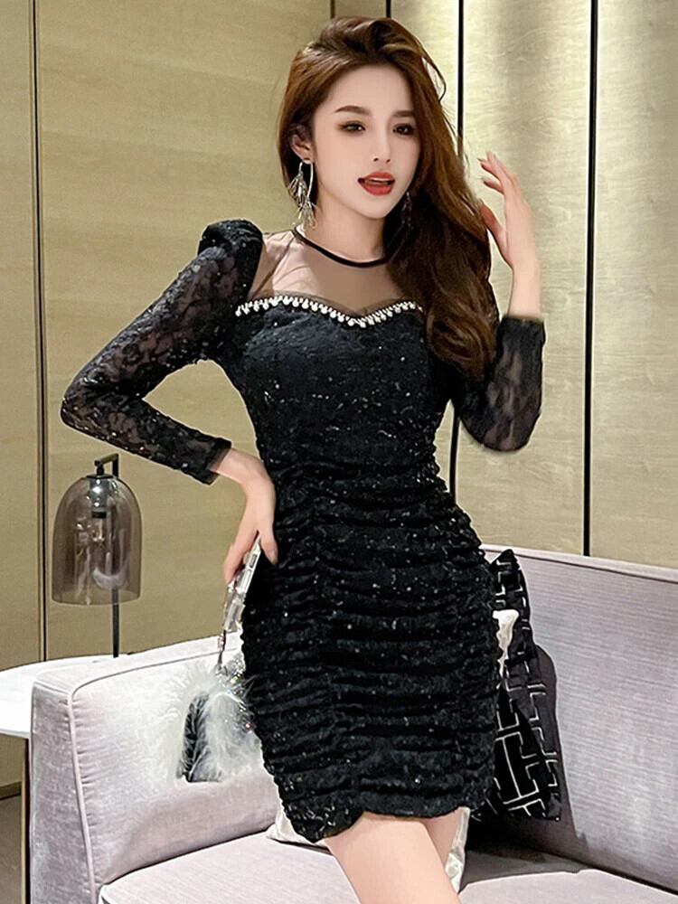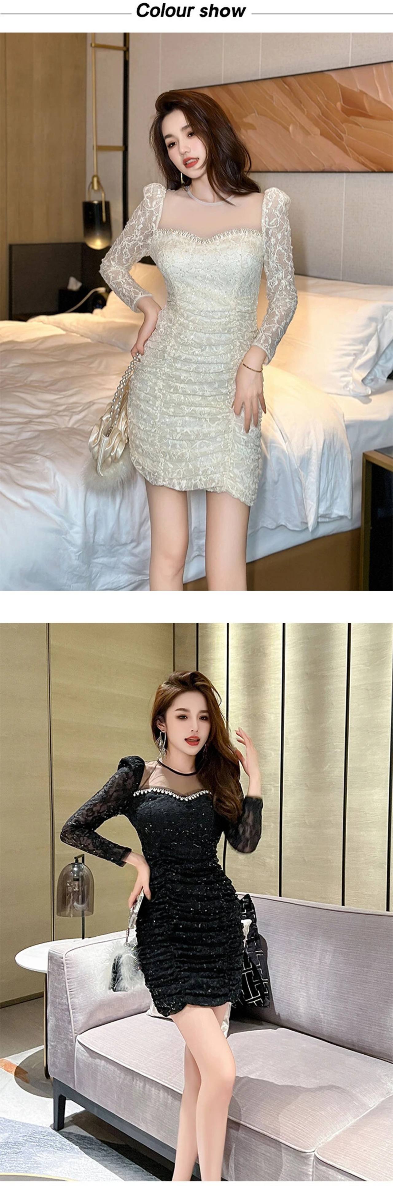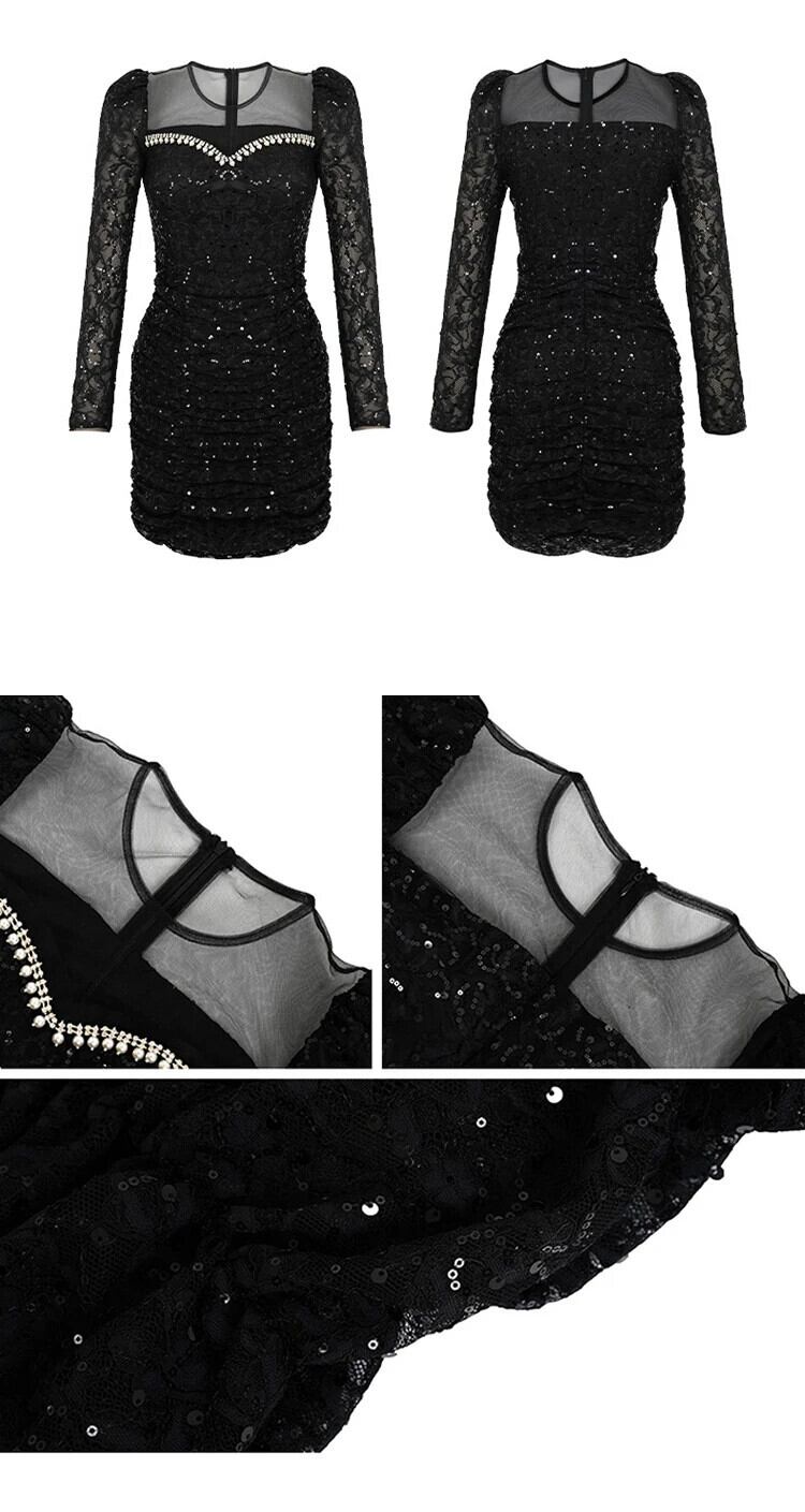 Hotsweet レーススパンコールイブニングドレスシック薄手セクシー O ネックスリムミニショートパーティーウエディング Vestidos フィエスタ 大人ガーリー スウィート キュート カジュアル Oネック