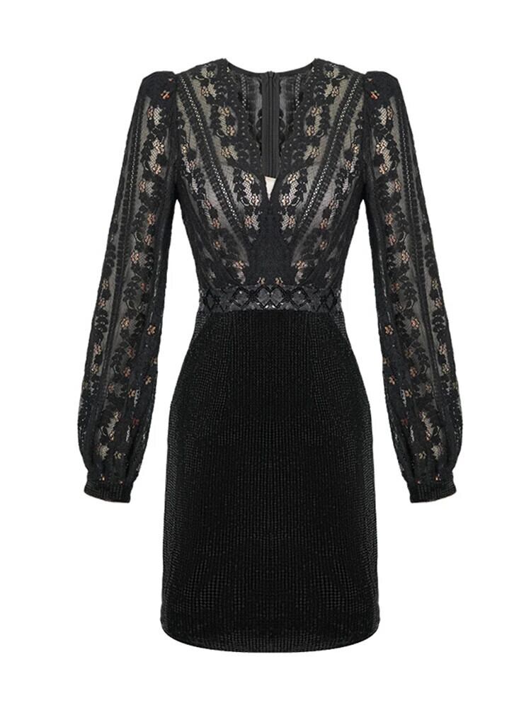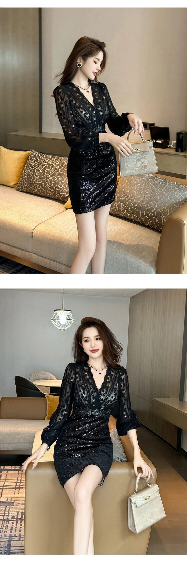 黒スパンコールレースイブニングドレス甘いセクシー V ネックスリムミニショートパーティーウエディング Vestidos フィエスタ ブラック 大人ガーリー スウィート キュート カジュアル Vネック