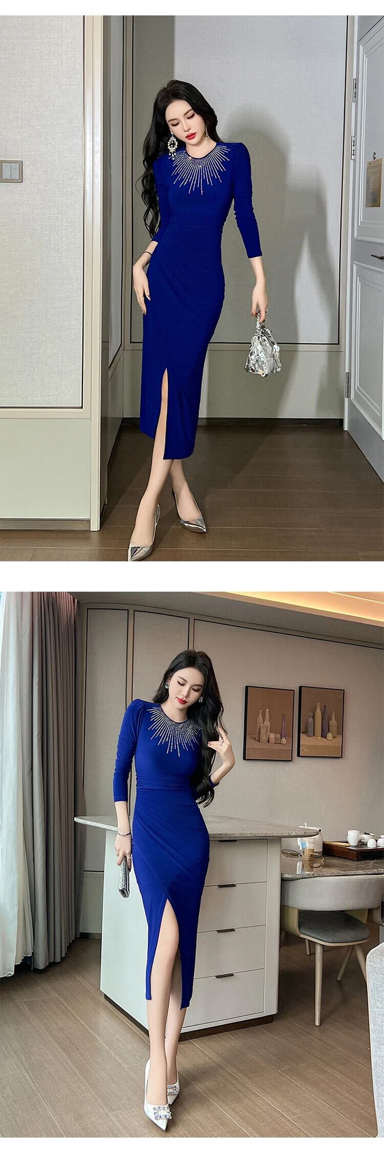 レディーブルー高級ストレッチイブニングドレスオフィス O ネックスキニースリットパーティードレスローブ Vestidos フィエスタ Oネック 会社 学校 通勤や通学にも