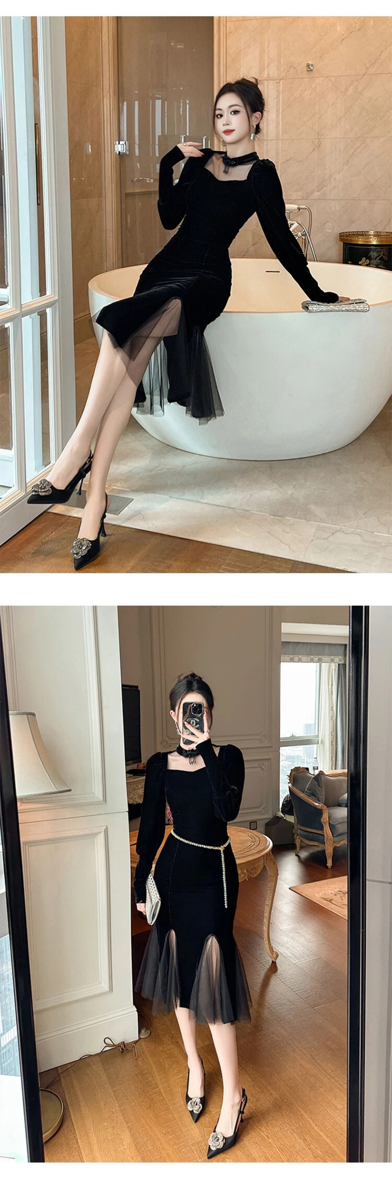 黒イブニングドレスシックシースルーセクシー長袖スキニースリムパーティーウエディングドレス Vestidos ロング ブラック