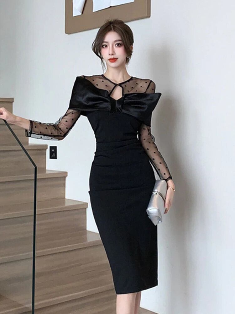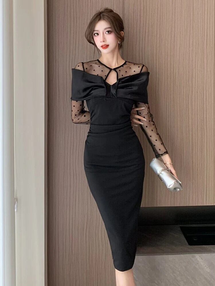 黒イブニングドレスシックシースルーセクシー長袖スリムパーティーウエディングローブ Vestidos フィエスタ ロング ブラック