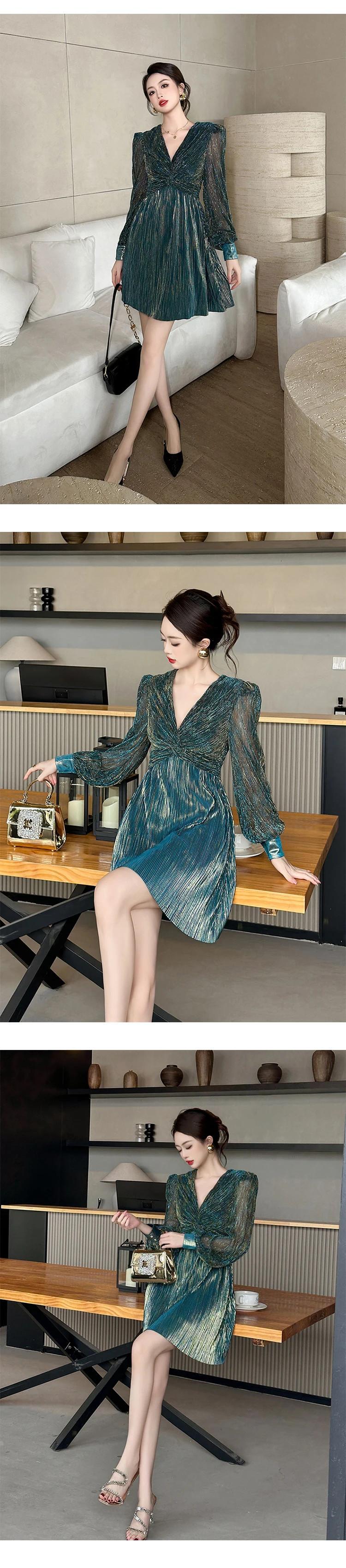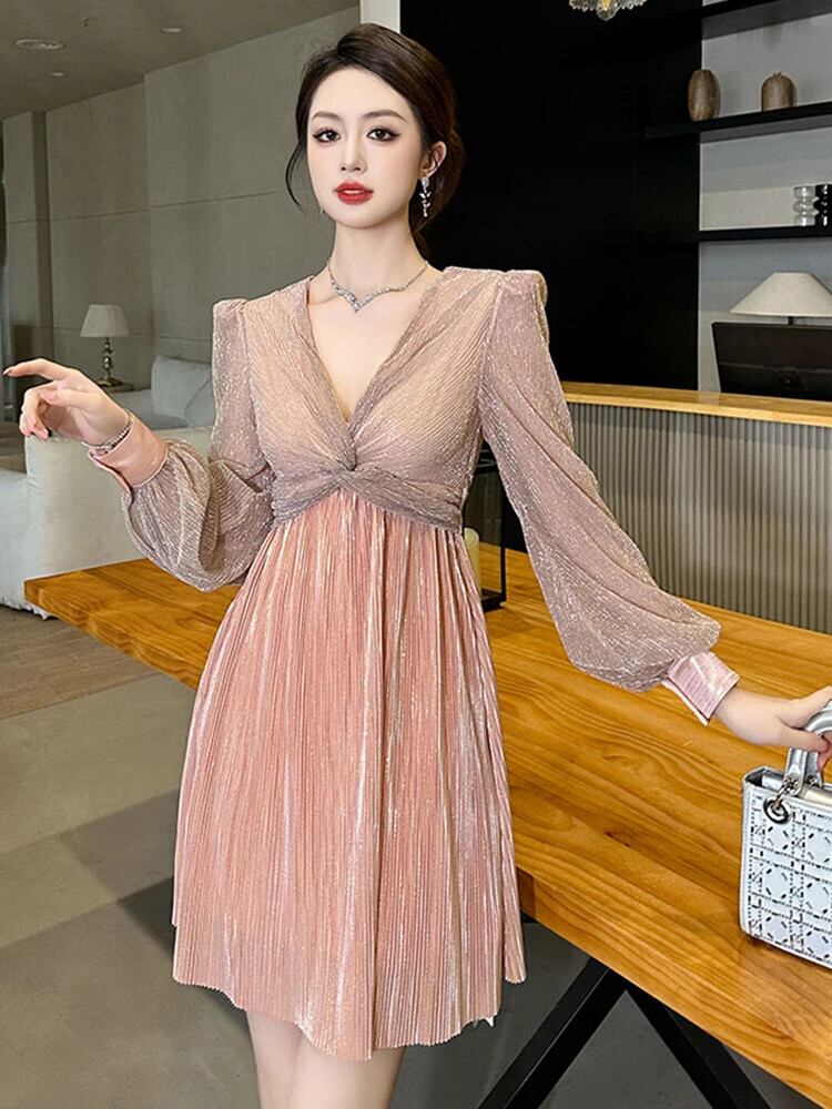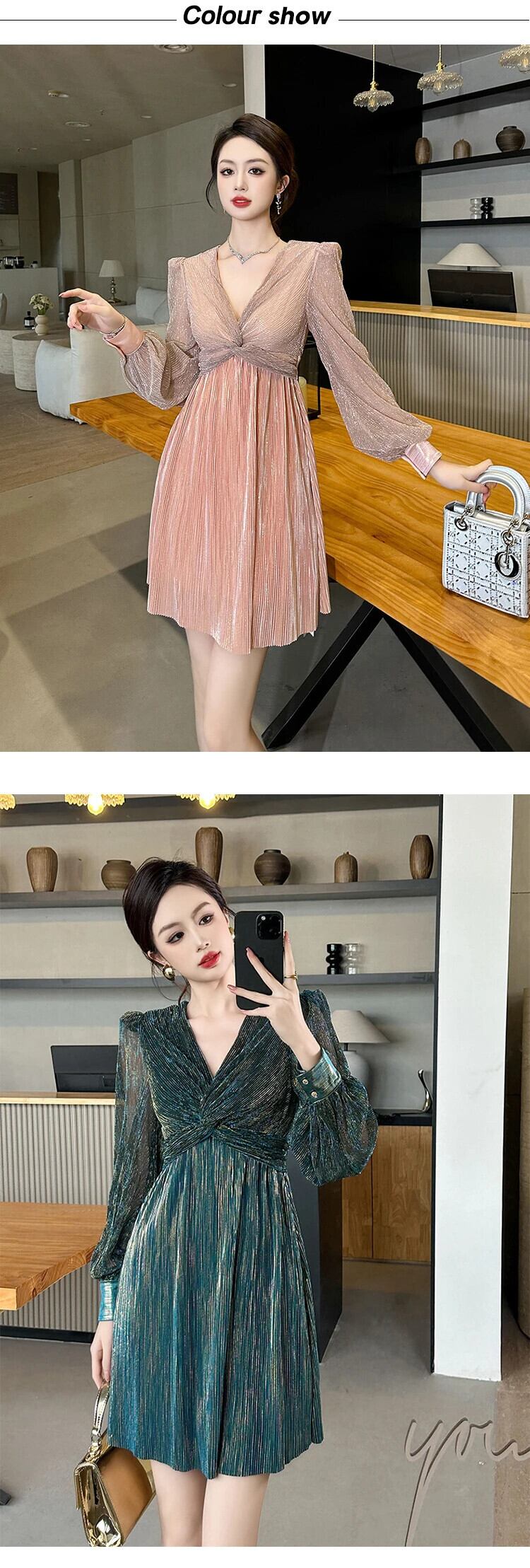 休暇光沢ある明るいイブニングドレススウィートシックセクシー V ネックひだスリムショートパーティードレス Vestidos フィエスタ 大人ガーリー キュート カジュアル Vネック シルク