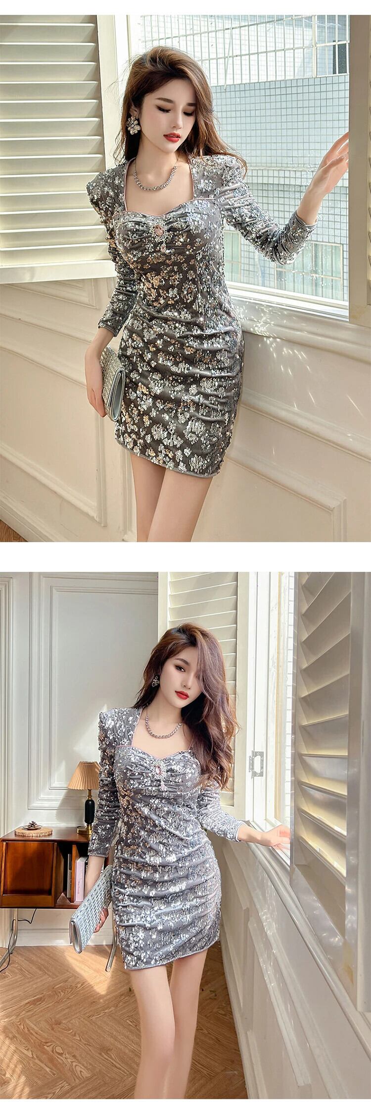 光沢あるスパンコールイブニングショートドレス高級スクエアカラースリムパーティーウエディング Vestido フィエスタ スクウェア