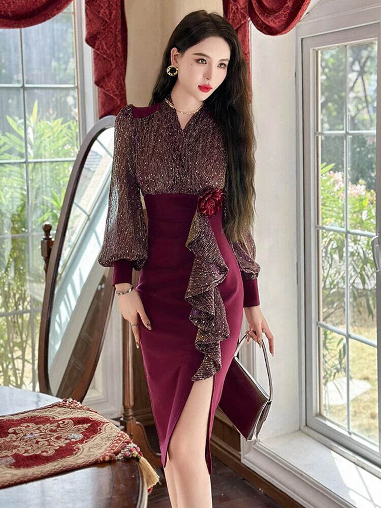 レディフェイク 2 ピースレディイブニングドレスシックグリッター光沢ある V ネックスリムパーティーウエディング Vestido Vネック