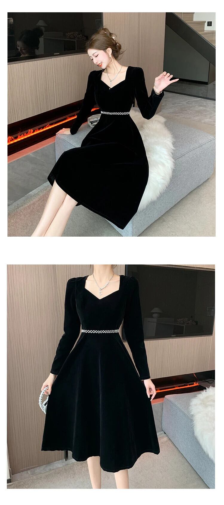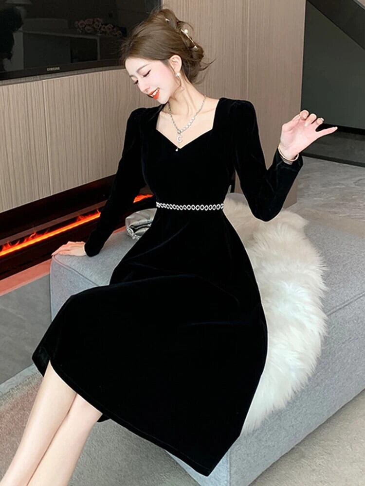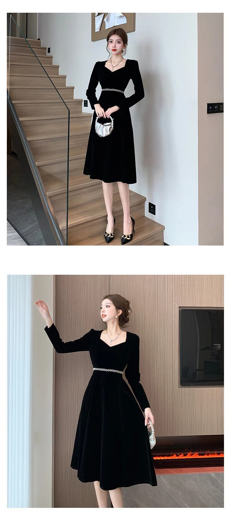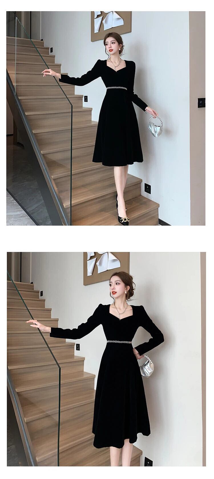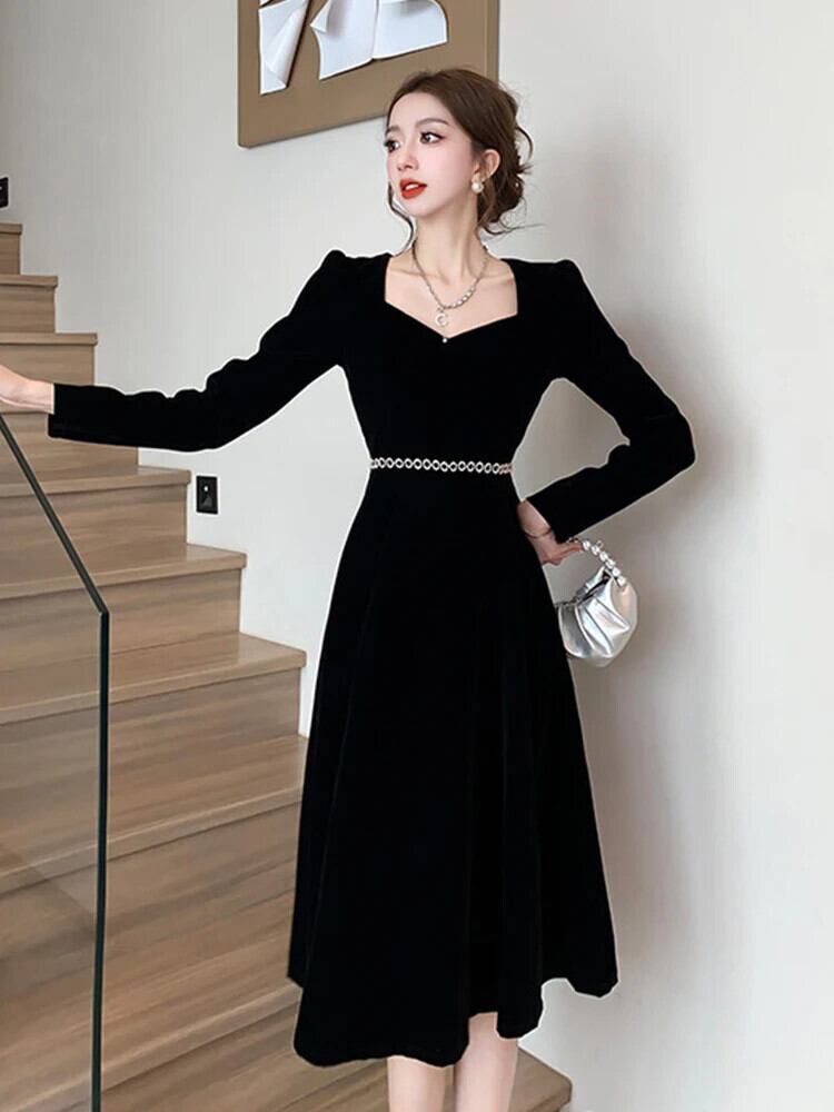 ワークスタイル黒ベルベットドレスオフィス通勤スクエアカラースリムパーティードレス Vestidos ブラック スクウェア 会社 学校 通勤や通学にも