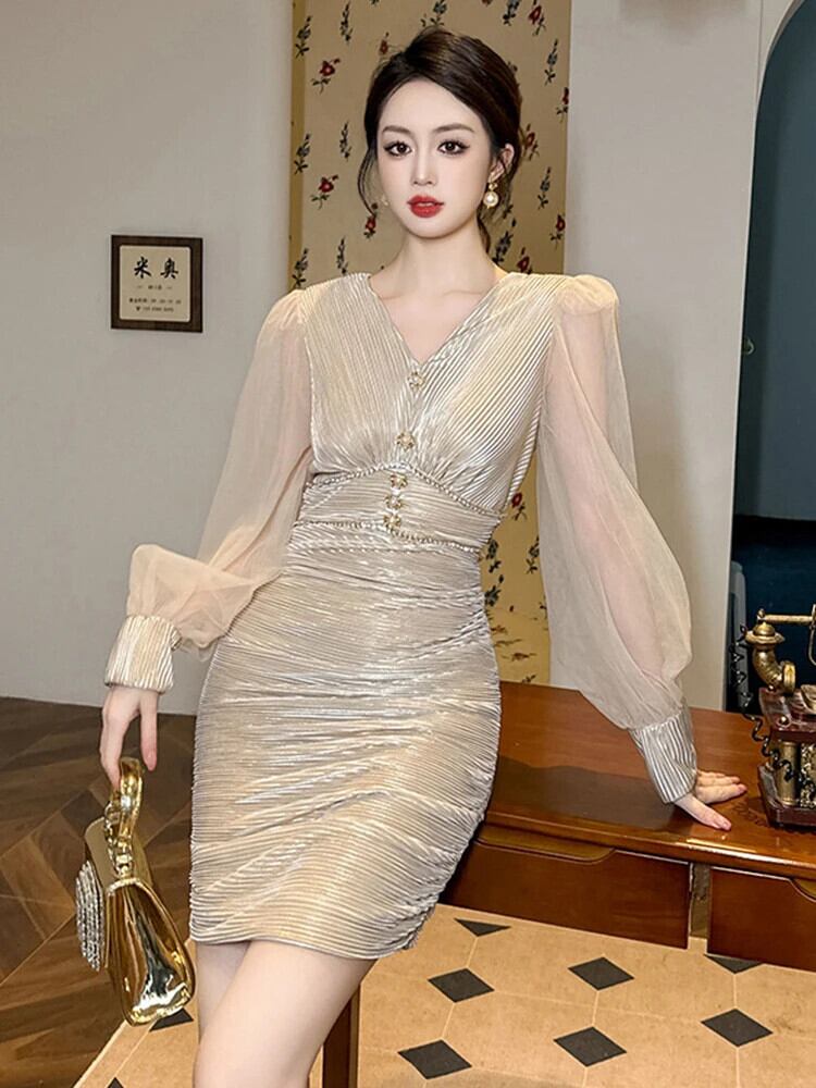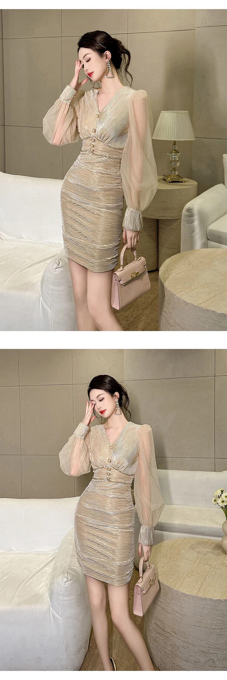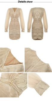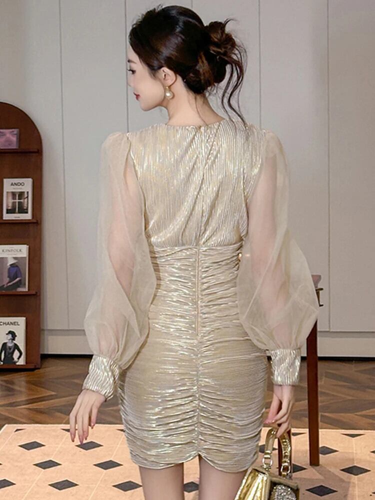 高級レディーグリッターシャイニーゴールドイブニングショートドレスシックセクシー V ネックスリムパーティードレス Vestido フィエスタ Vネック