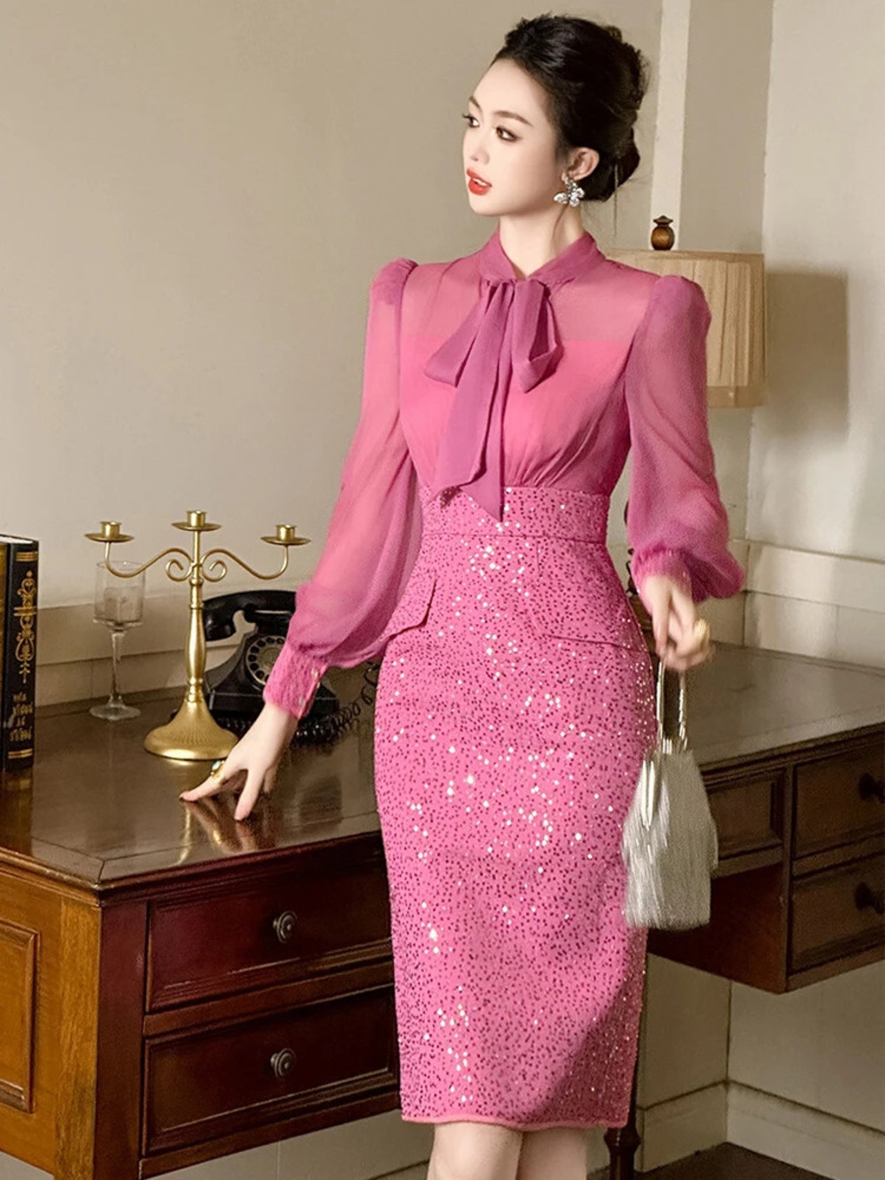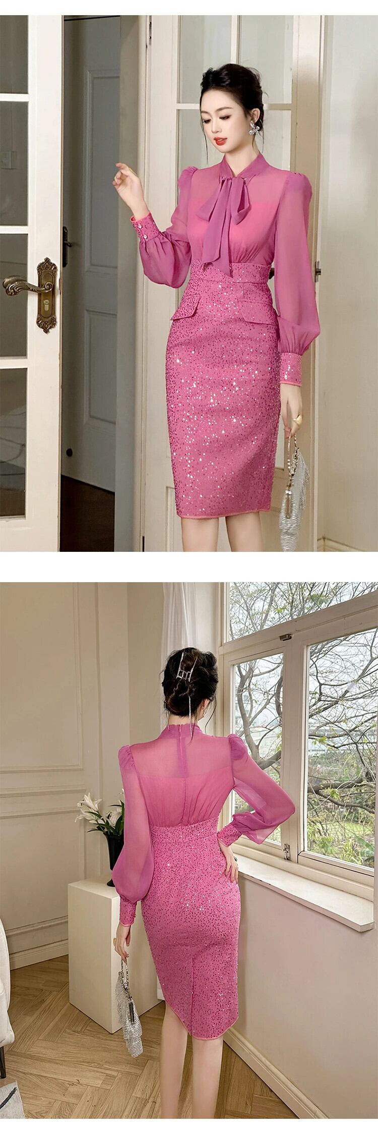 甘いビジネスワークスタイル mal ペンシルドレスオフィス通勤長袖ラップヒップミディ Vestidos ロング 大人ガーリー スウィート キュート カジュアル 会社 学校 通勤や通学にも