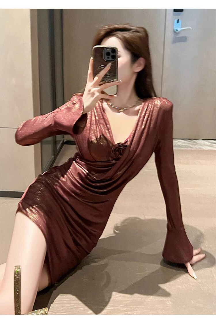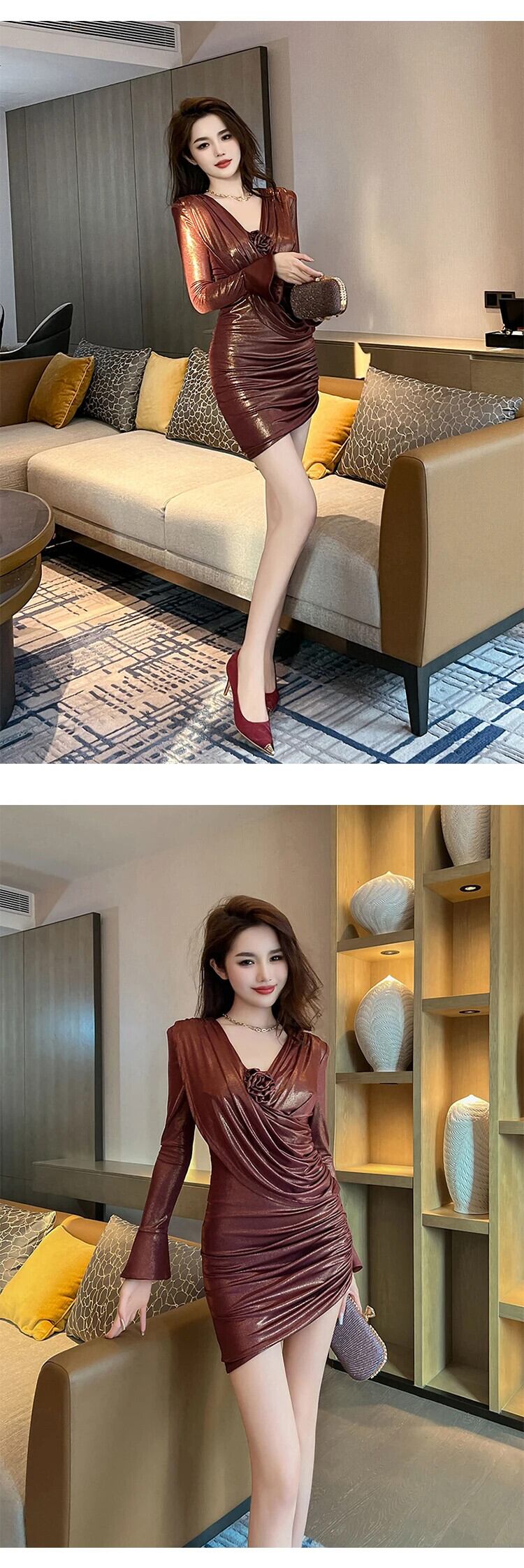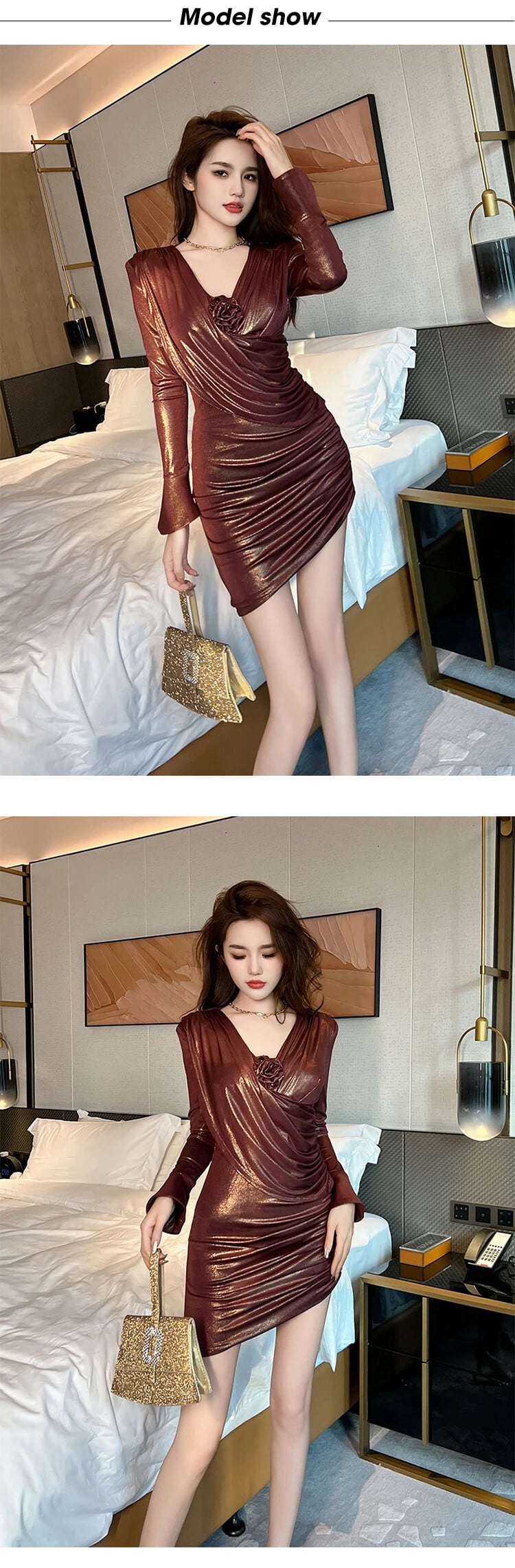 レディアメリカンレトロキラキライブニングドレスシックセクシー V ネックひだスリムミニショートパーティードレス Vestido フィエスタ Vネック