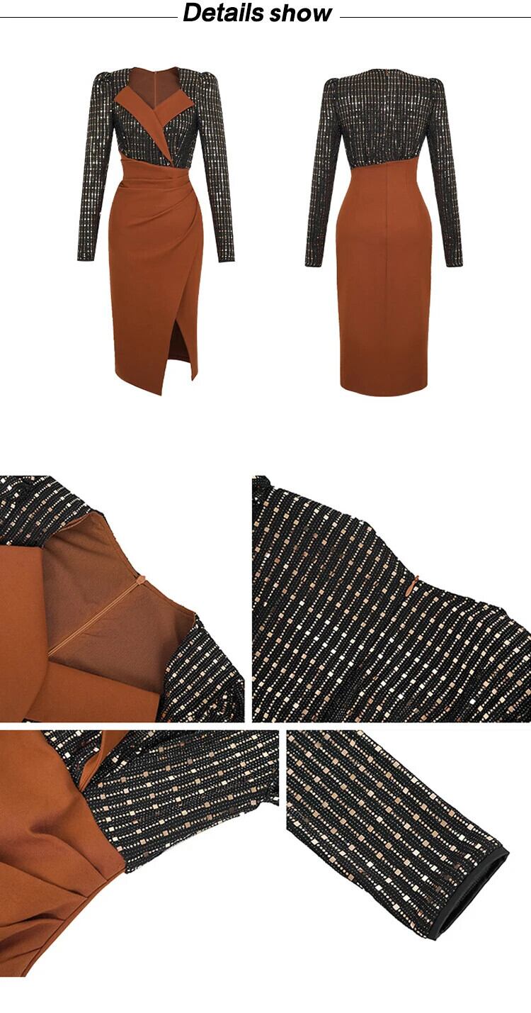 春ワークスタイルスパンコールスプライス非対称ドレスオフィス通勤セクシー V ネックスリムひだパーティー Vestido スプリング 春物 Vネック 会社 学校 通勤や通学にも