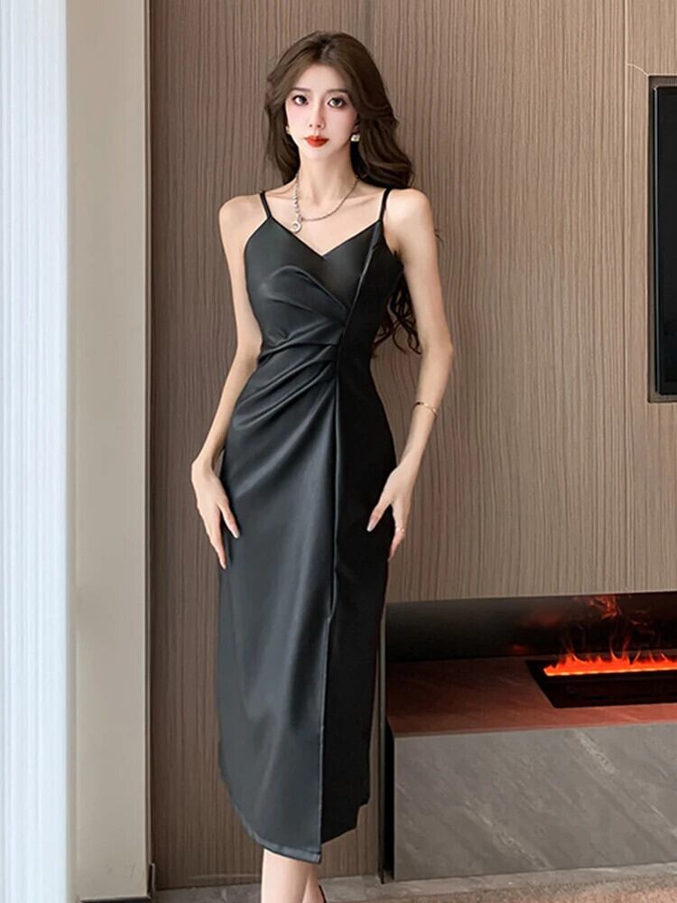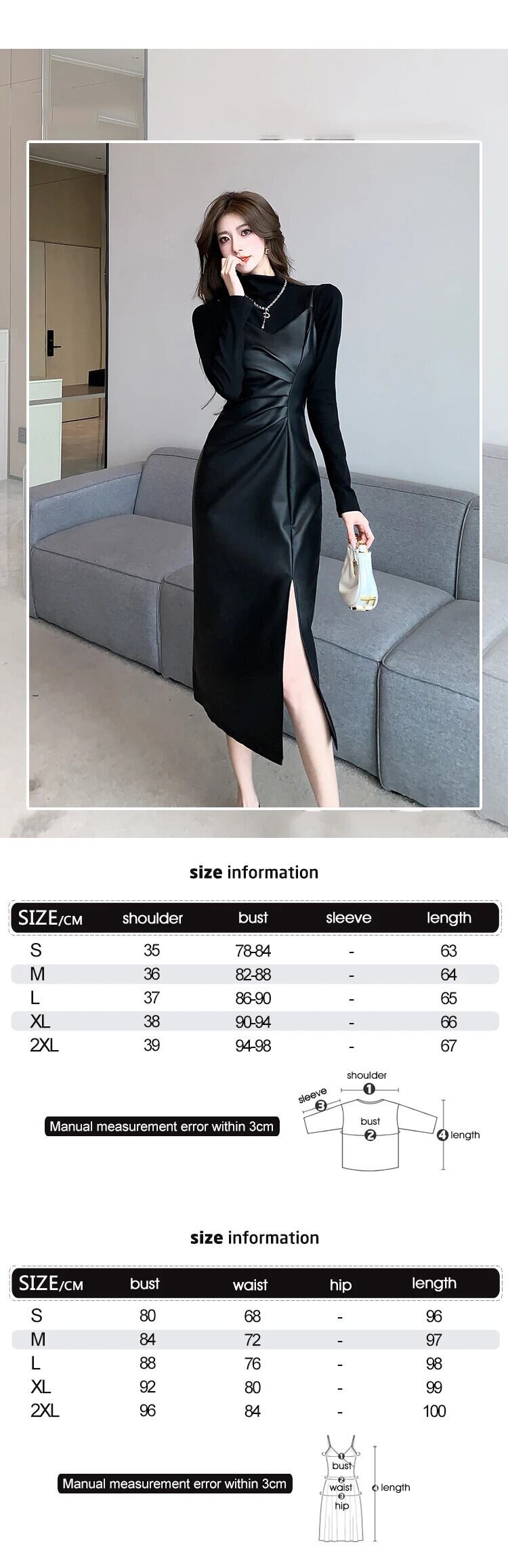 春トレンディ黒シック 2 ピース衣装ストレッチ Tシャツトップスと PU セクシーストラップスリムローブドレスセットストリート ブラック スプリング 春物