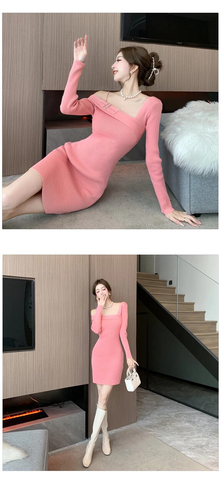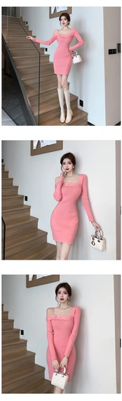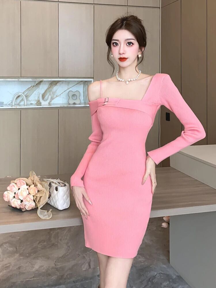 Y2K ニットストレッチ甘いショートドレスセーターセクシーオフショルダーボディコンミニパーティードレス Vestido 大人ガーリー スウィート キュート カジュアル