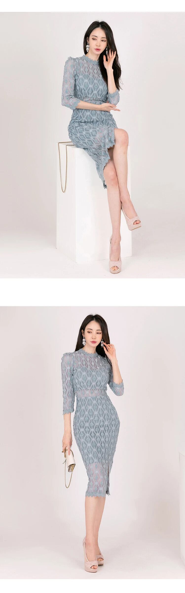 Hotsweet レースペンシルドレスシックシースルーセクシースタンドネックスリムミディパーティークラブ Vestidos フィエスタ 大人ガーリー スウィート キュート カジュアル
