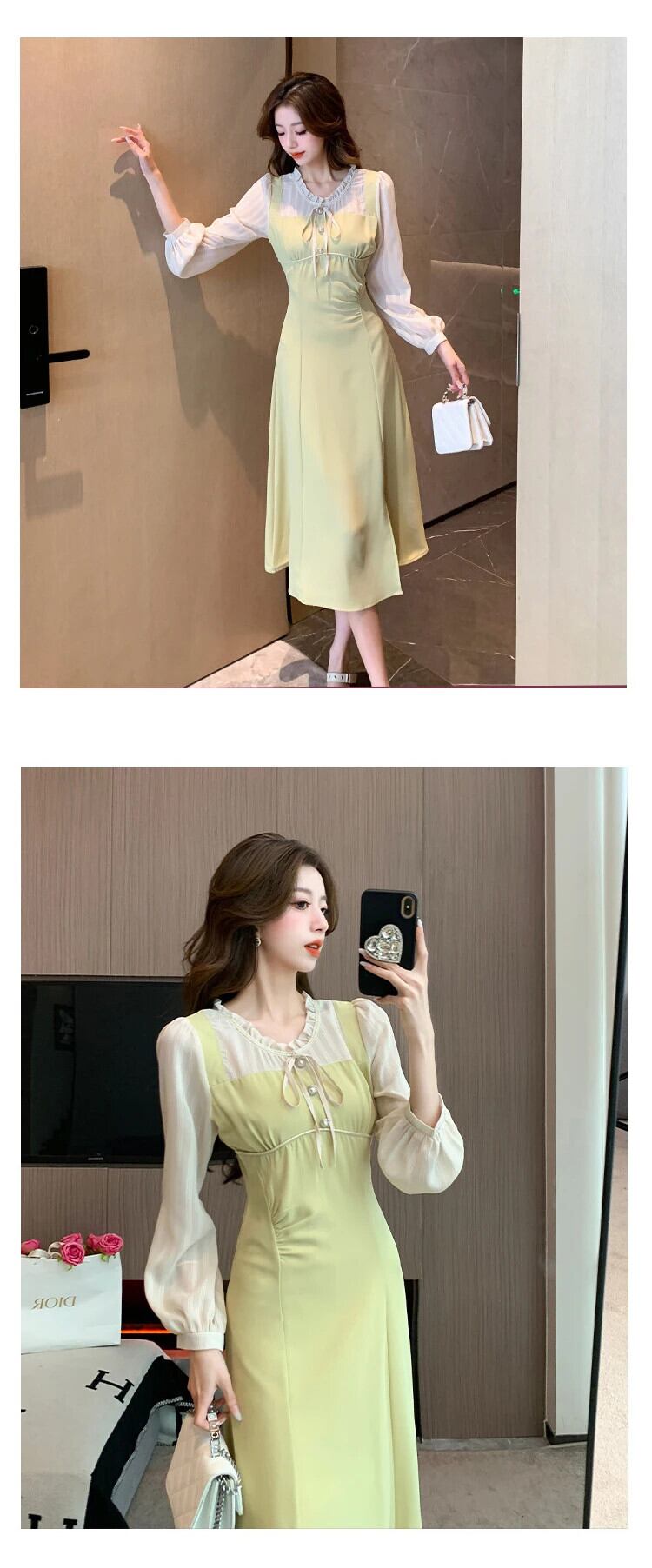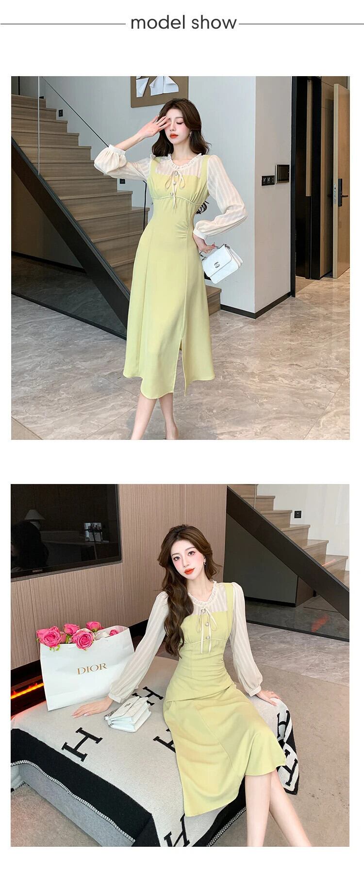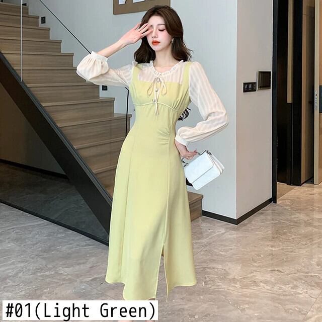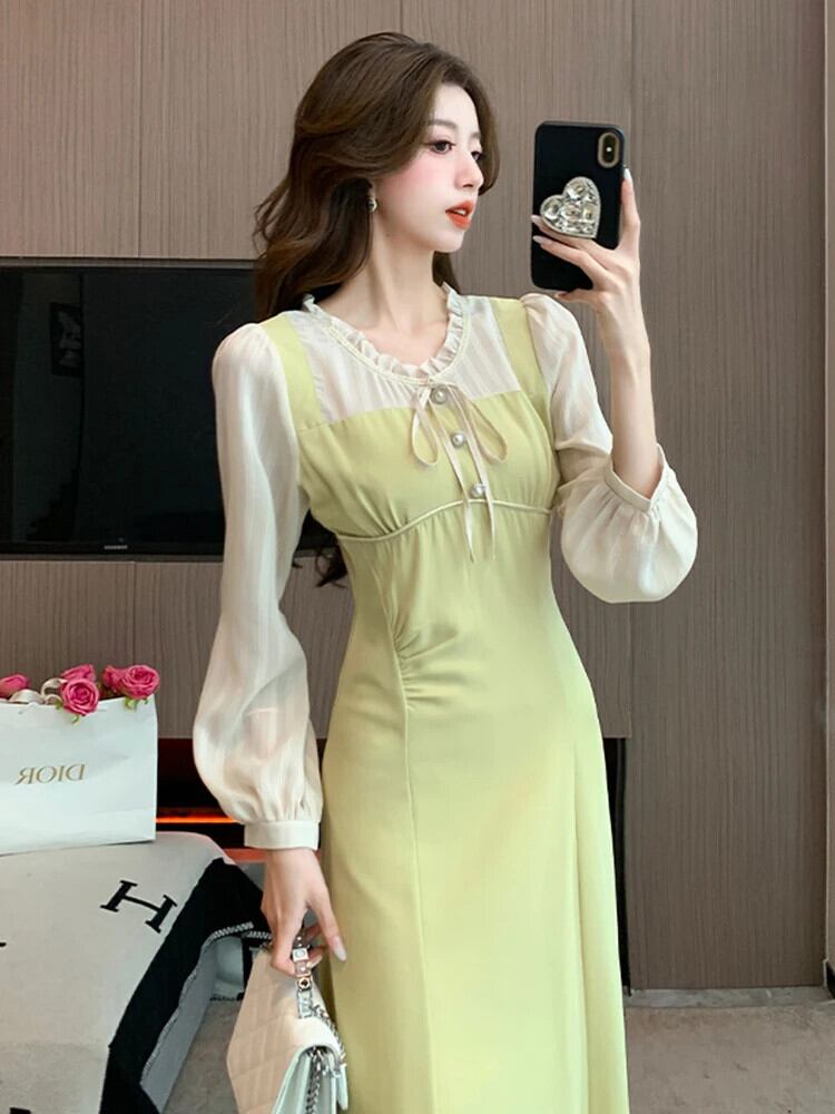 プレッピースタイル甘い A ラインロングドレスシック O ネックひだスリムスリットミディ Vestidos ストリートローブ 大人ガーリー スウィート キュート カジュアル Oネック Aライン