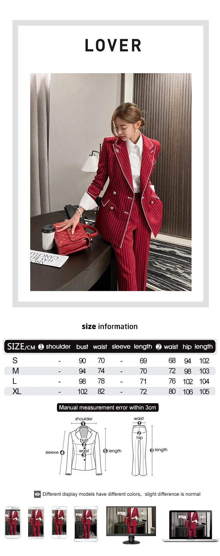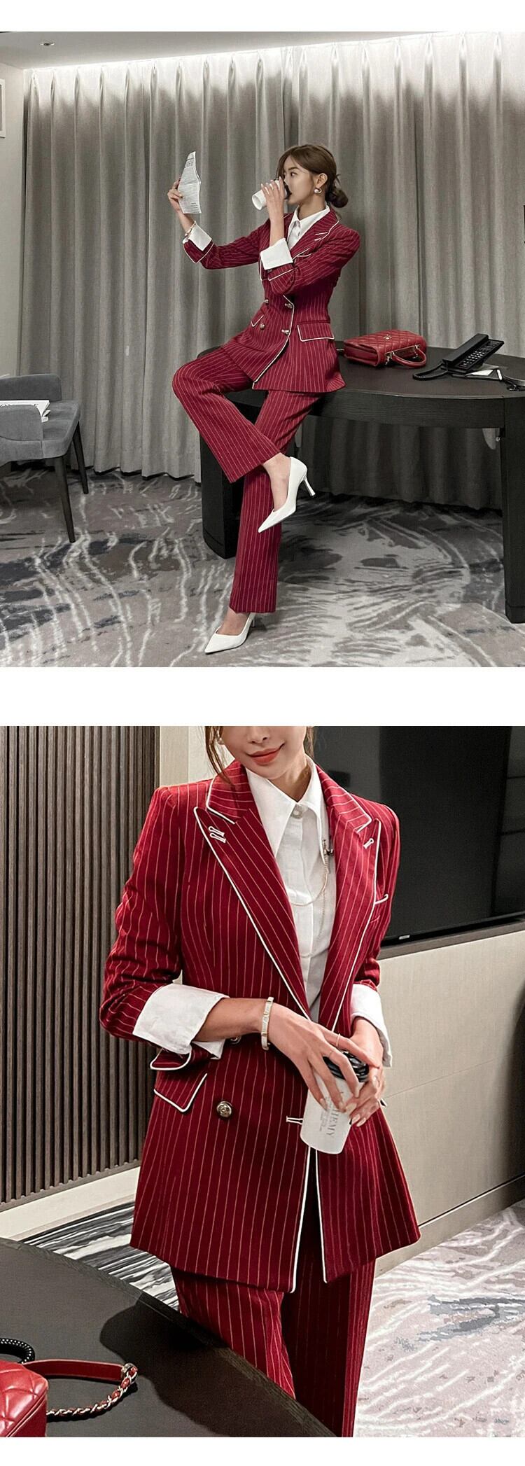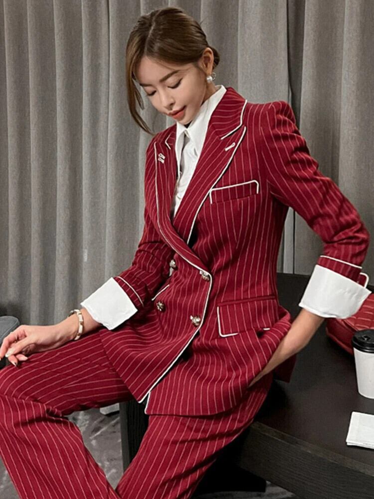 mal 通勤ストライプ 2 ピース衣装スーツダブルブレストトップスコートブレザースーツとズボン長ズボンセット ロング
