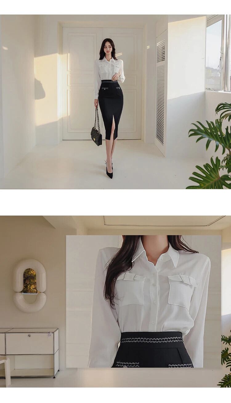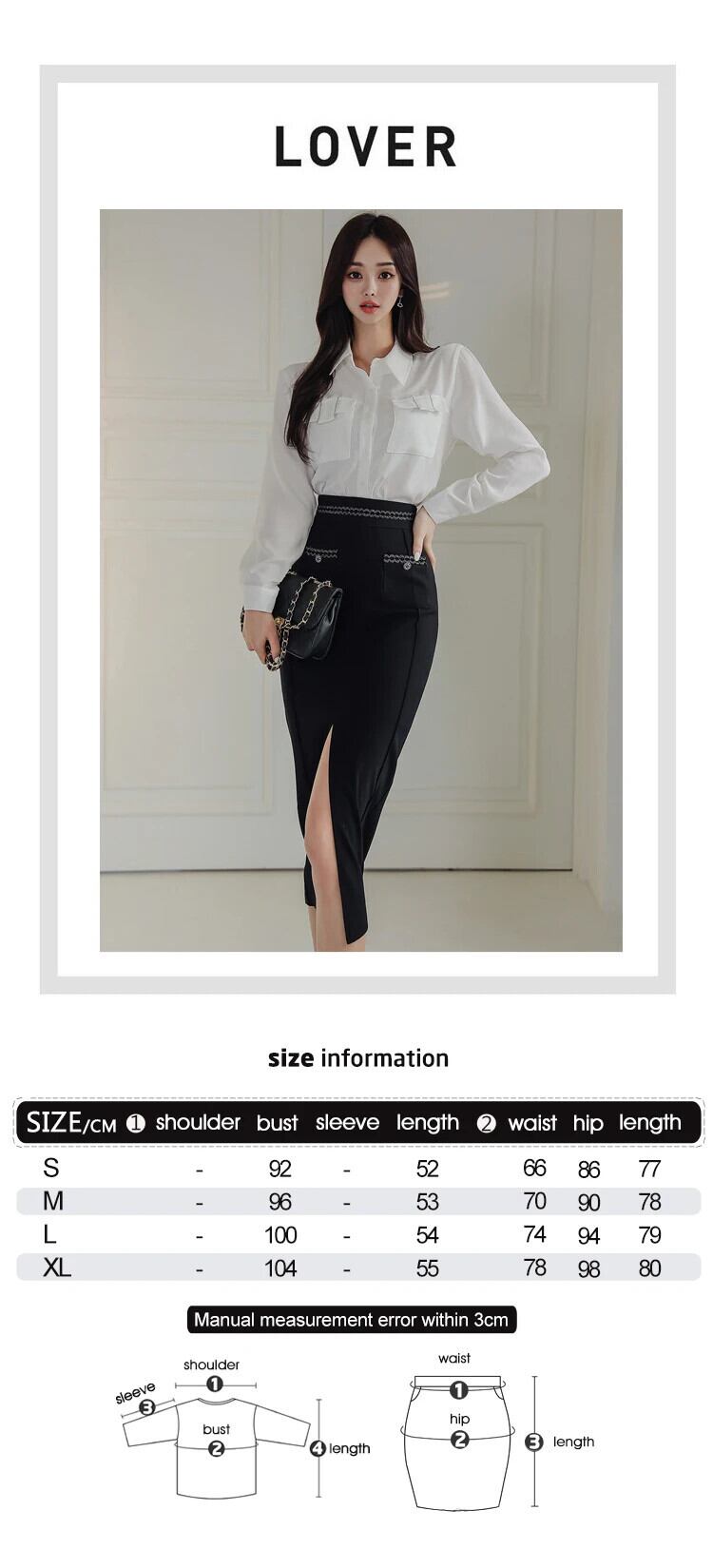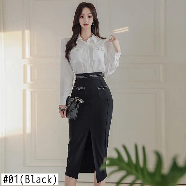 ワークスタイルレディマル通勤 2 ピース衣装白トップスシャツブラウスと黒スカートセット ホワイト ブラック