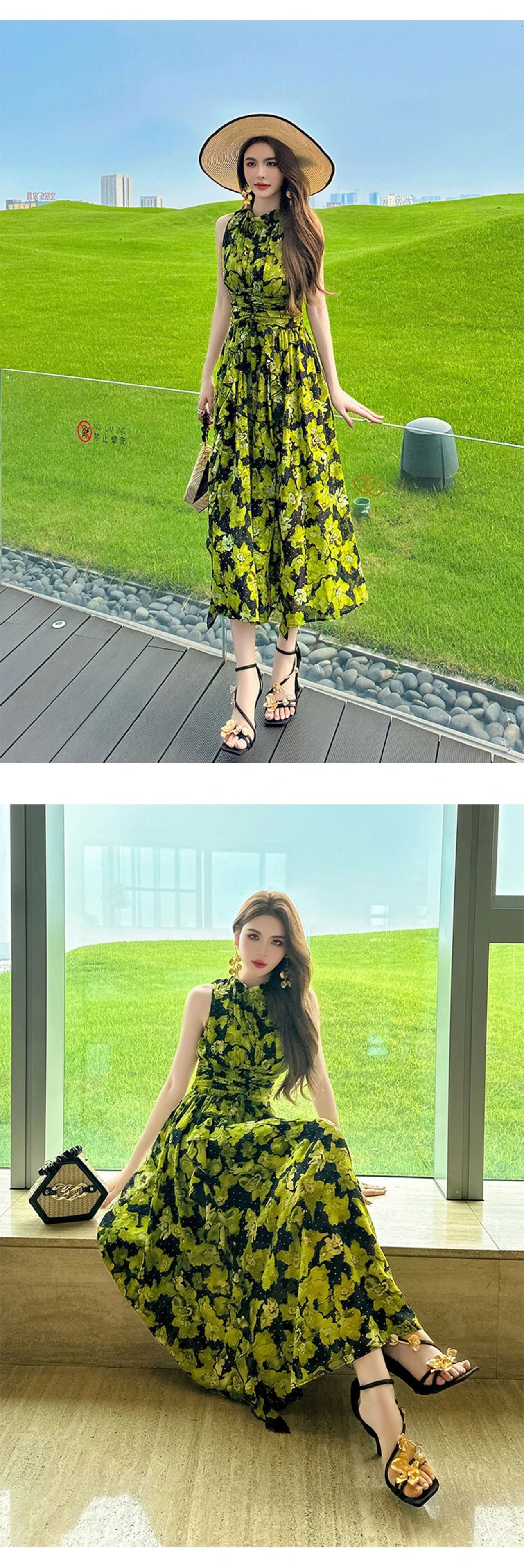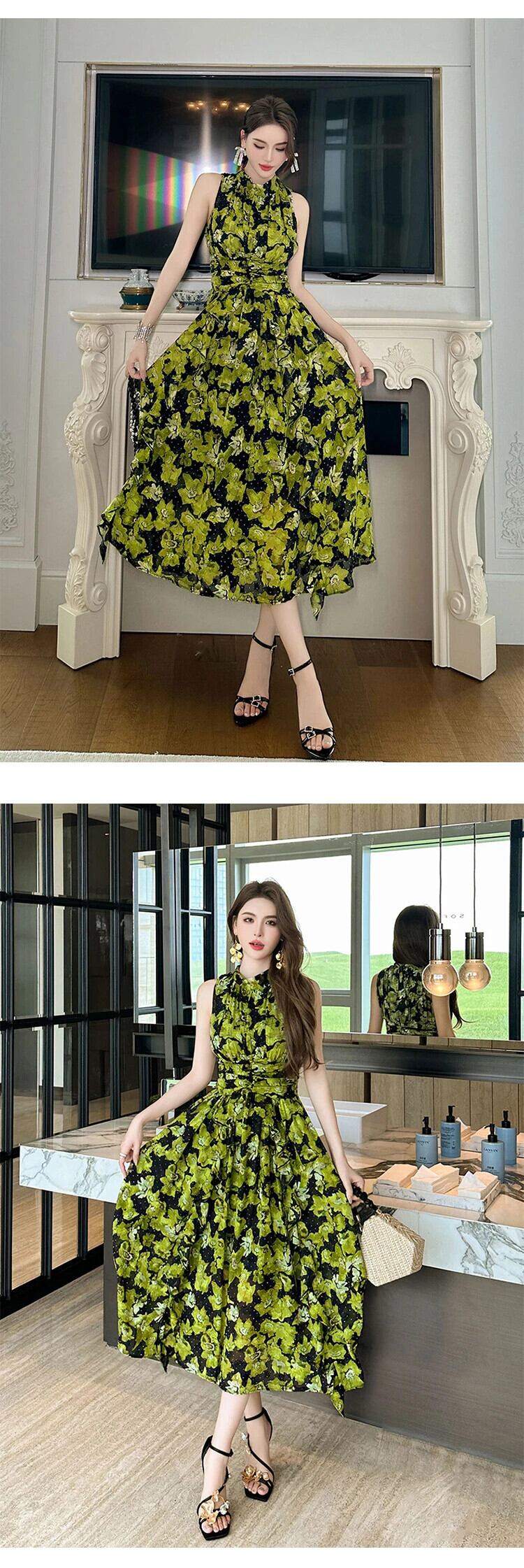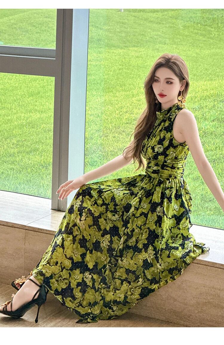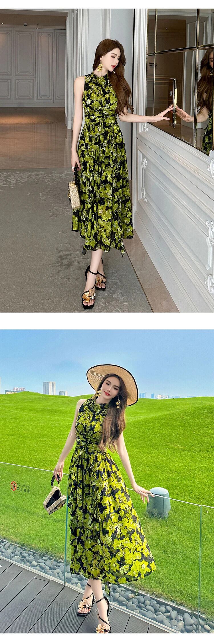 夏甘いフラワープリント休暇ホリデーイブニングロングドレスノースリーブスリムパーティーローブ Vestidos 大人ガーリー スウィート キュート カジュアル サマー 夏物 フラワーデザイン