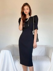 通勤ワークスタイル mal ペンシルドレスオフィス黒シンプルパフスリーブスリムミディ Vestidos ストリート ブラック 会社 学校 通勤や通学にも