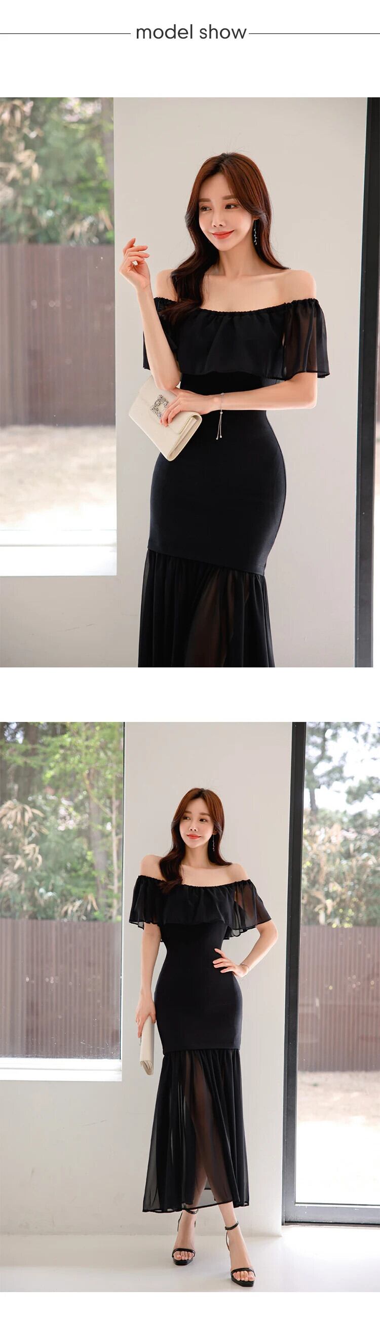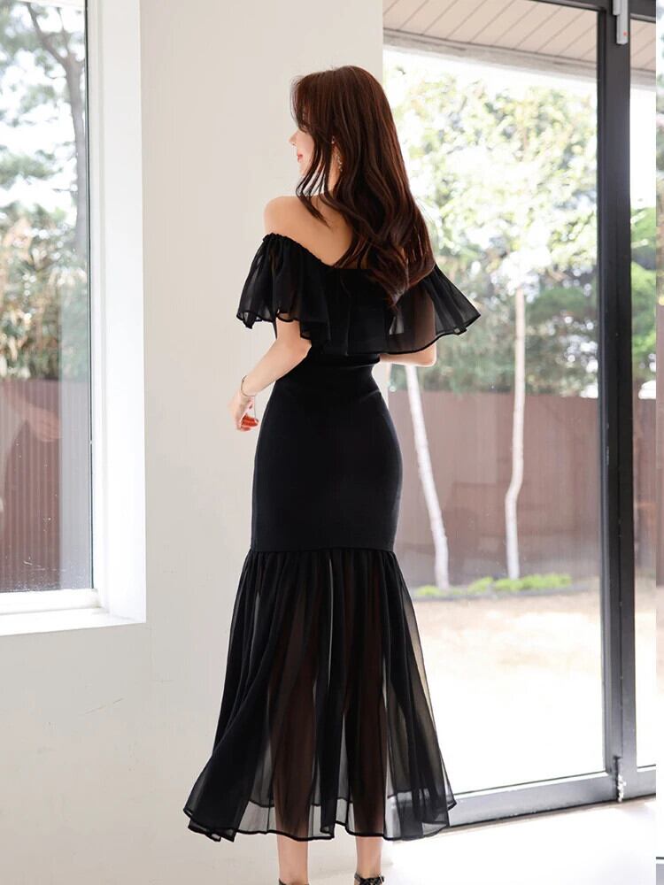 夏黒休暇ビーチホリデードレスフリル薄手セクシーオフショルダースリムマキシパーティー Vestido ローブ ブラック サマー 夏物
