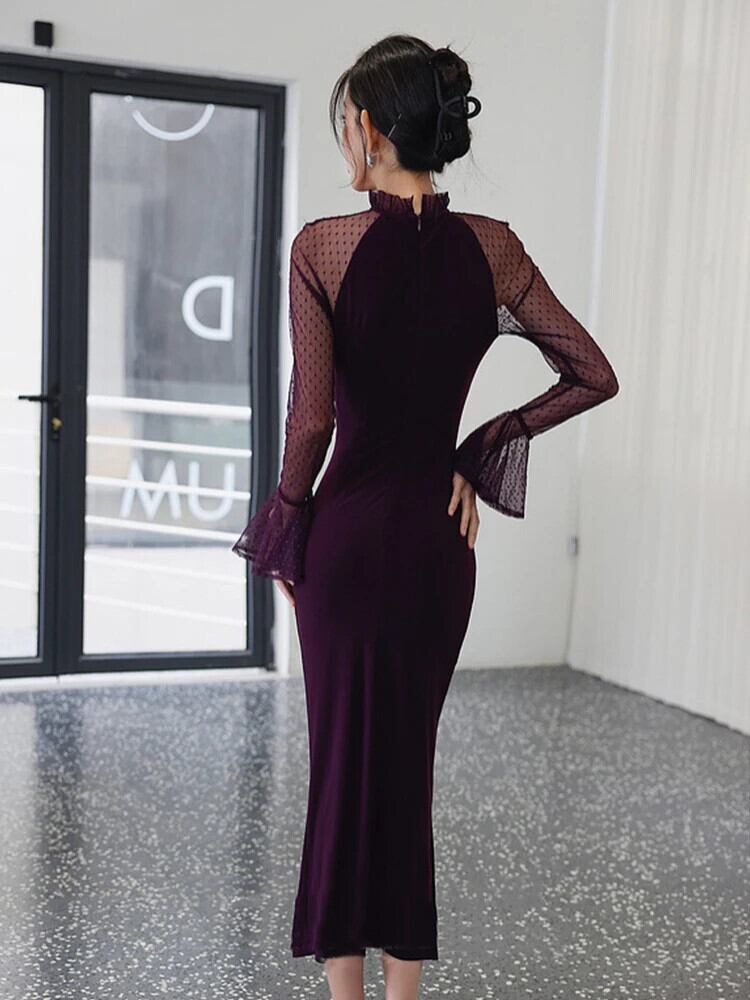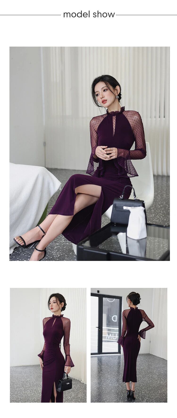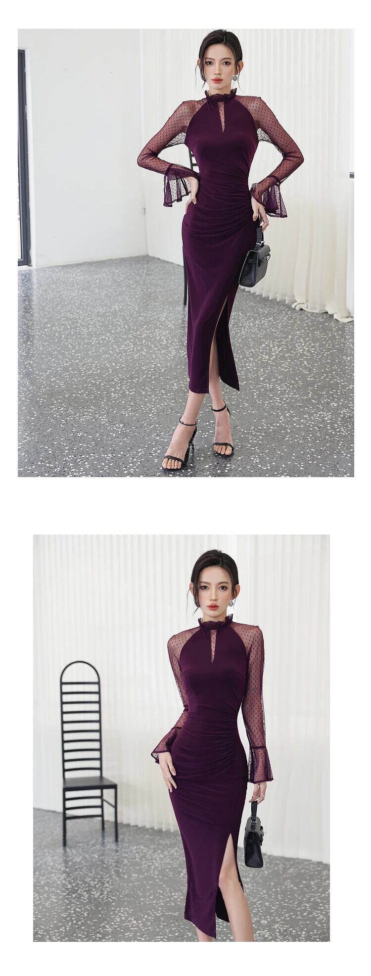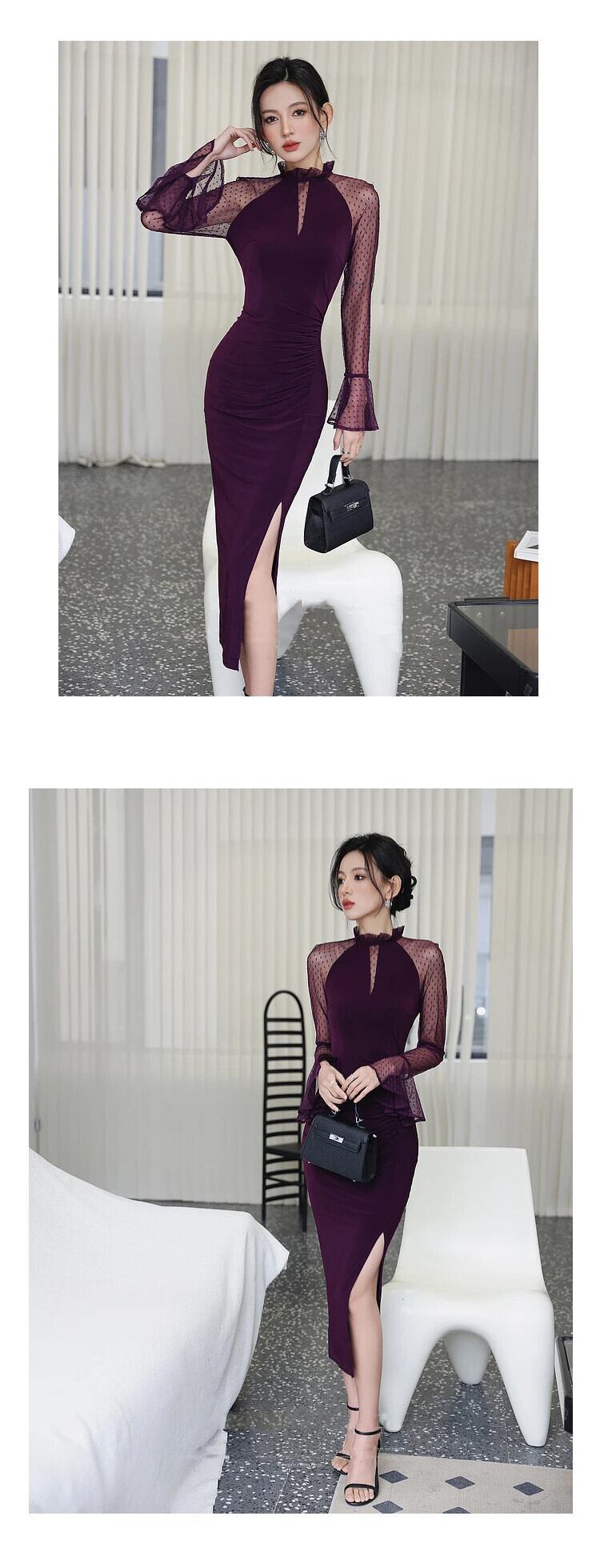スウィートパープルイブニングドレスレディセクシーフレアスリーブボディコンひだローブパーティー誕生日 Vestidos 大人ガーリー キュート カジュアル