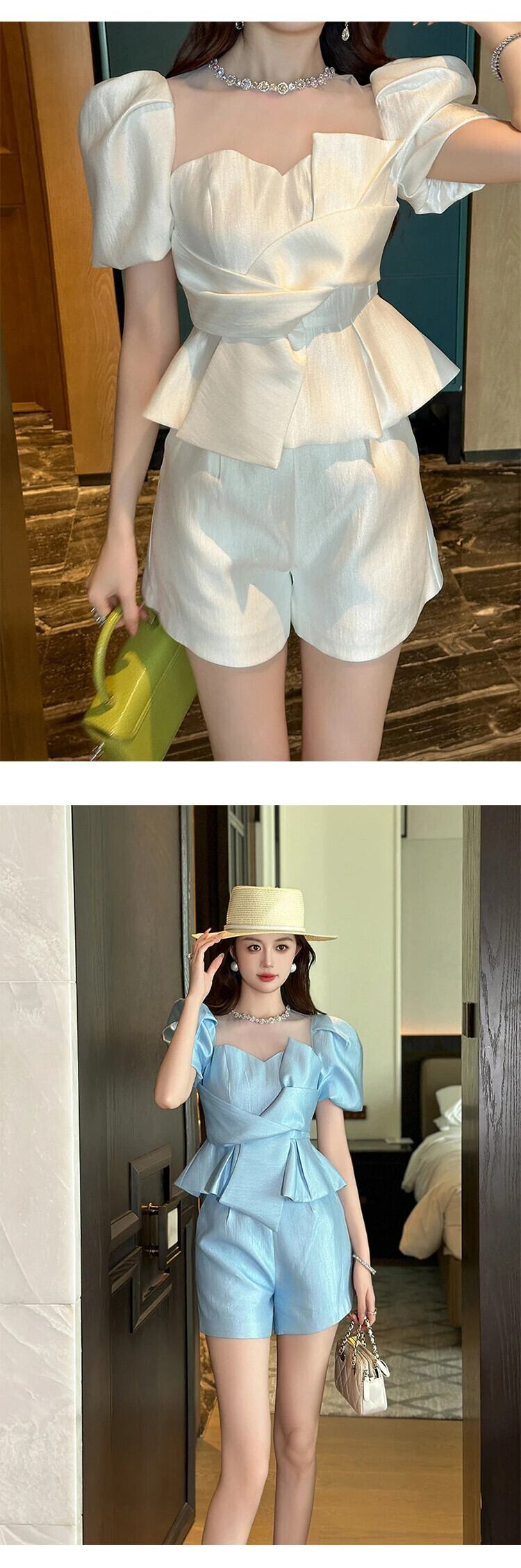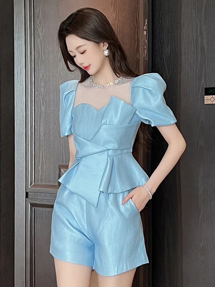 高級ダイヤモンドサテンシアーメッシュスプライスショートシャツ甘い弓パフスリーブひだトップスブラウス リボン 大人ガーリー スウィート キュート カジュアル