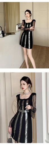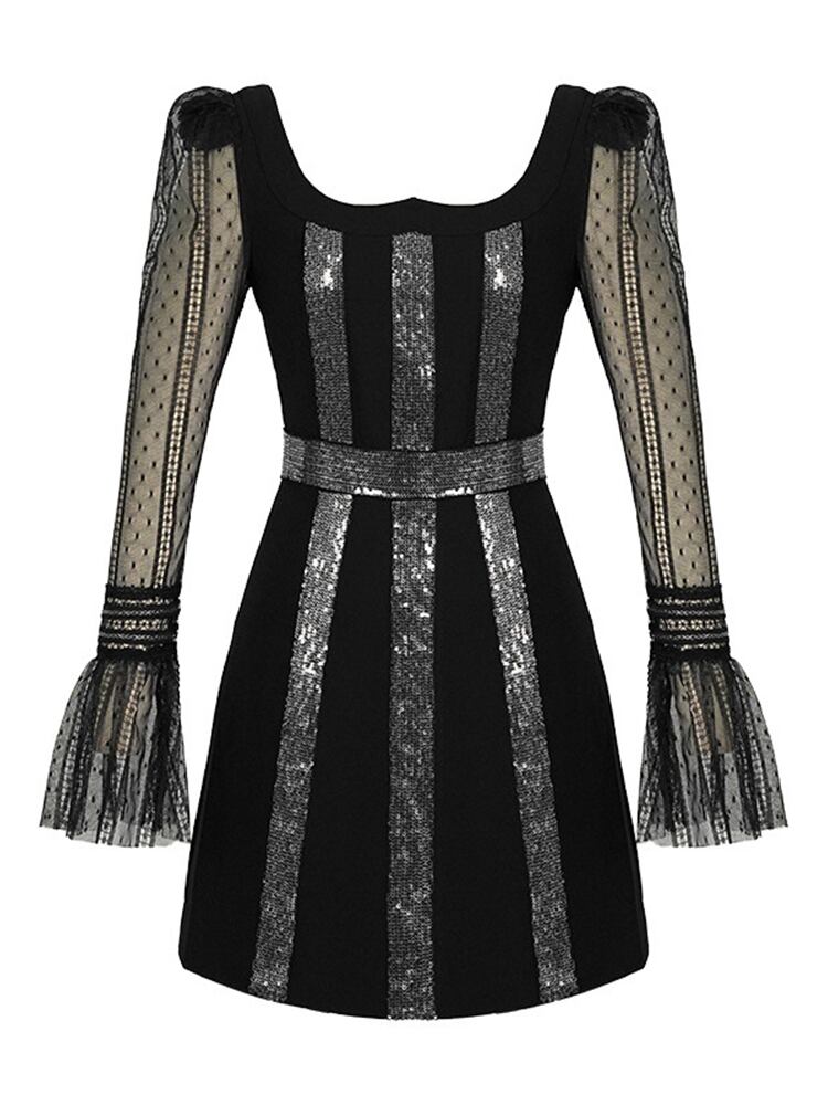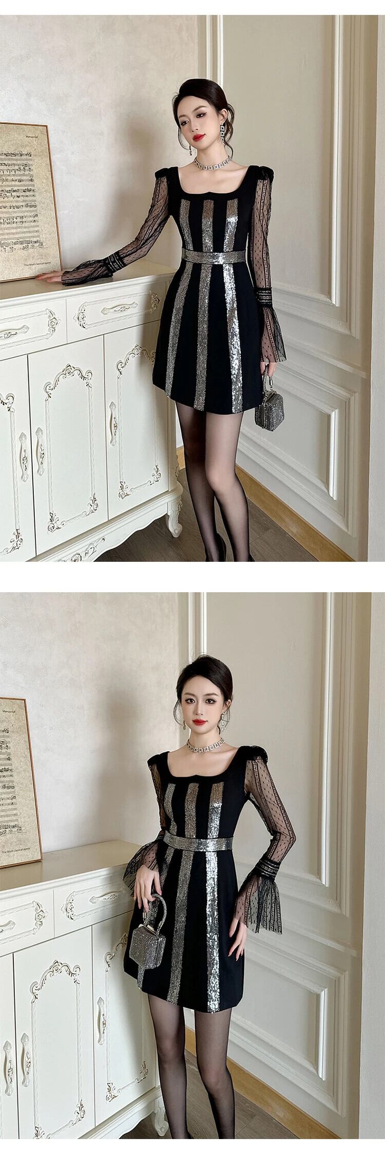 Y2K 黒スパンコールイブニングショートドレス Hotsweet セクシーフレアスリーブスリムパーティー誕生日 Vestidos フィエスタ ブラック 大人ガーリー スウィート キュート カジュアル