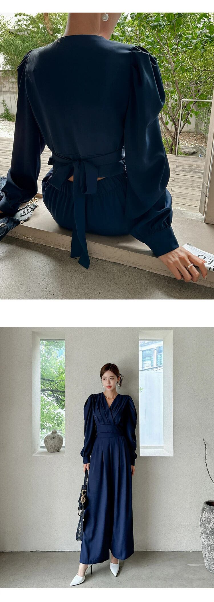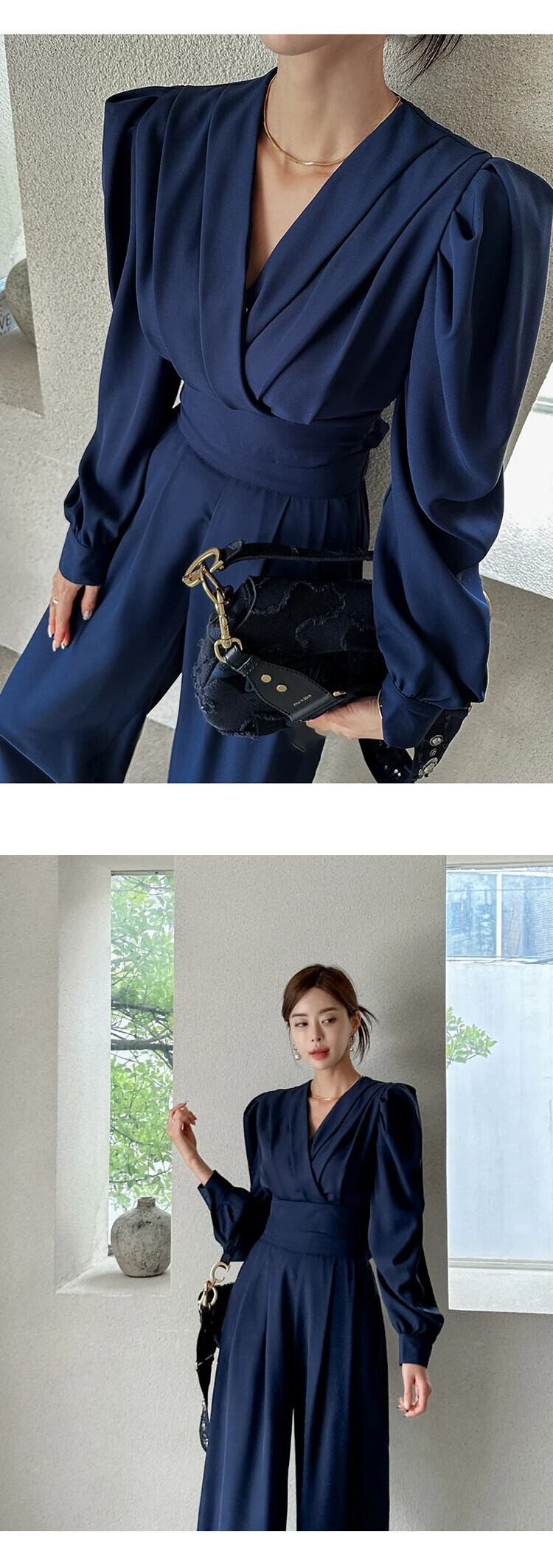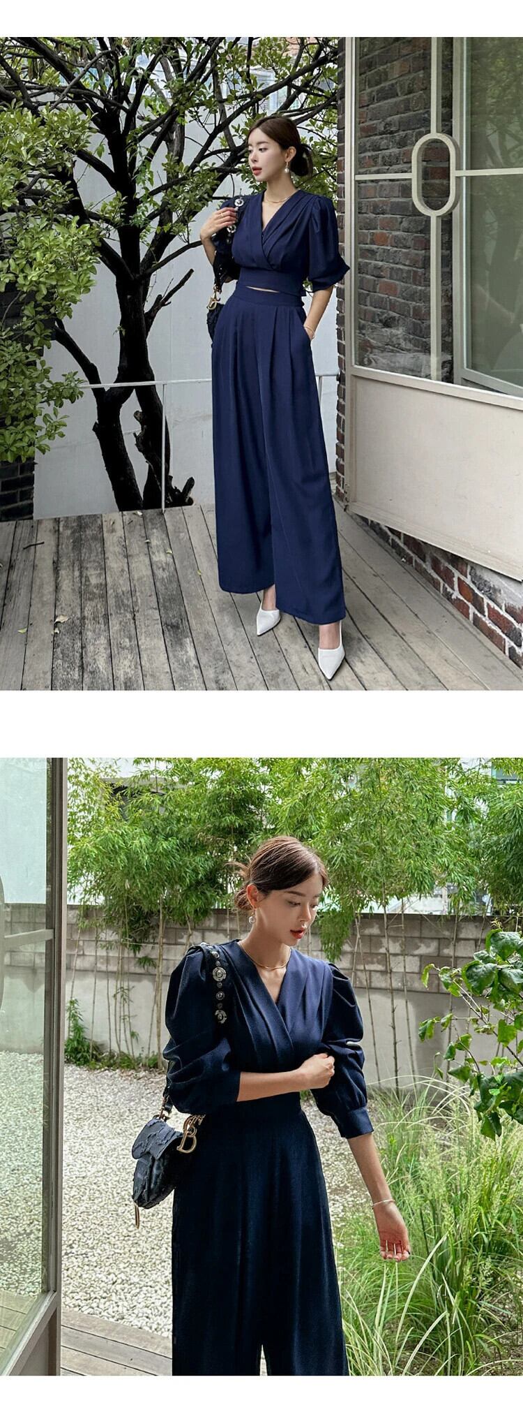 ワークスタイルレディマルソリッド2ピース衣装スーツクロップドトップスシャツブラウスとワイドレッグルーズロングパンツセット ワイドパンツ ソリッドカラー