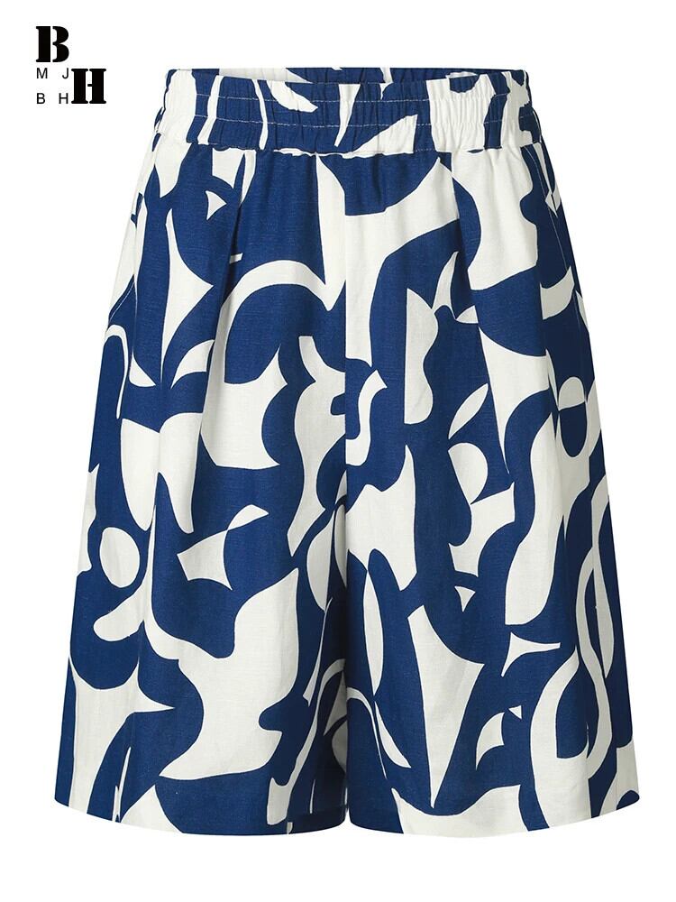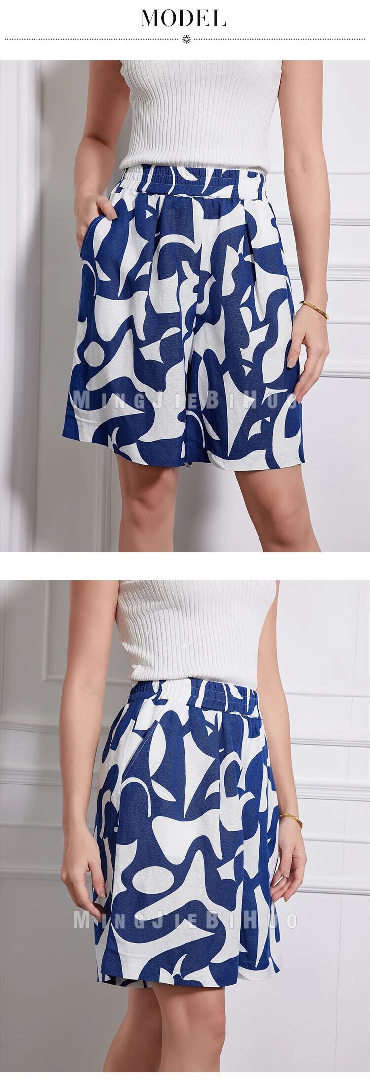 プラスサイズコットンリネン休暇ビーチショーツパンツプリント弾性ウエストズボンワイドレッグルーズパンツストリート エラスティック 伸縮 大きめサイズ ブルマー ワイドパンツ
