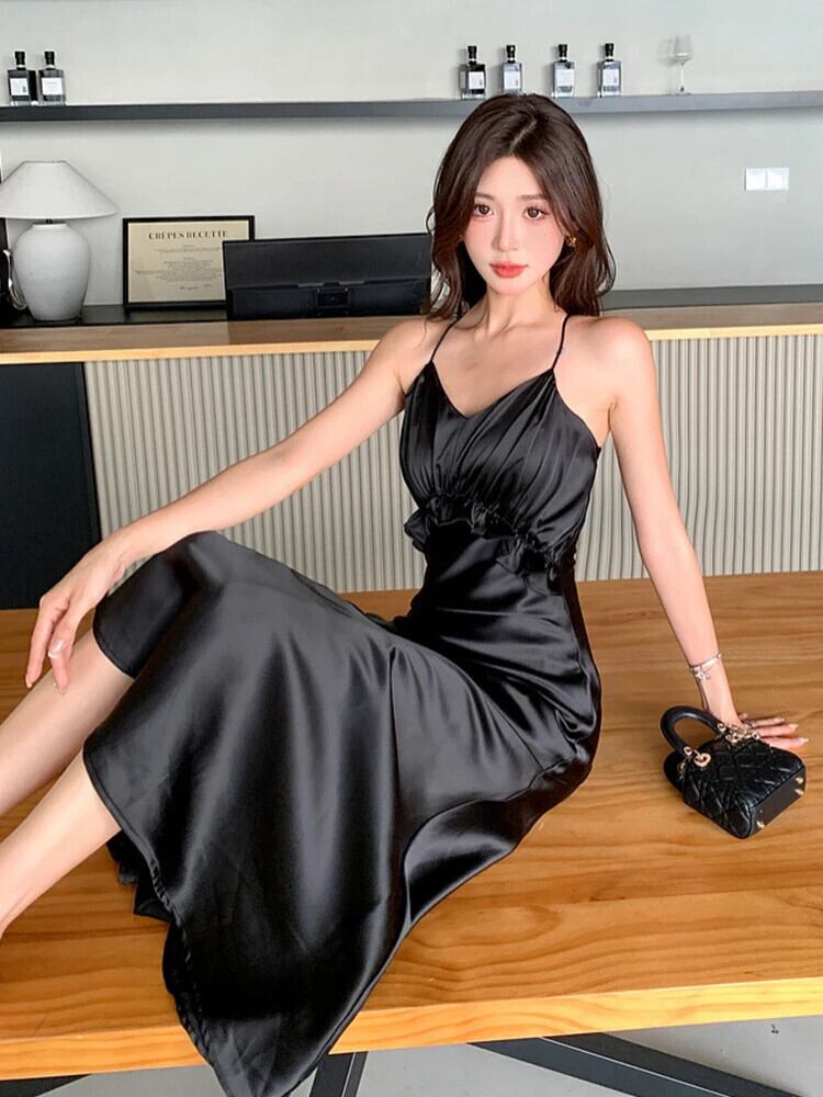 夏黒フリル休暇ホリデードレスセクシースリング V ネック背中開いたスリムミディパーティー誕生日 Vestido ブラック サマー 夏物 Vネック