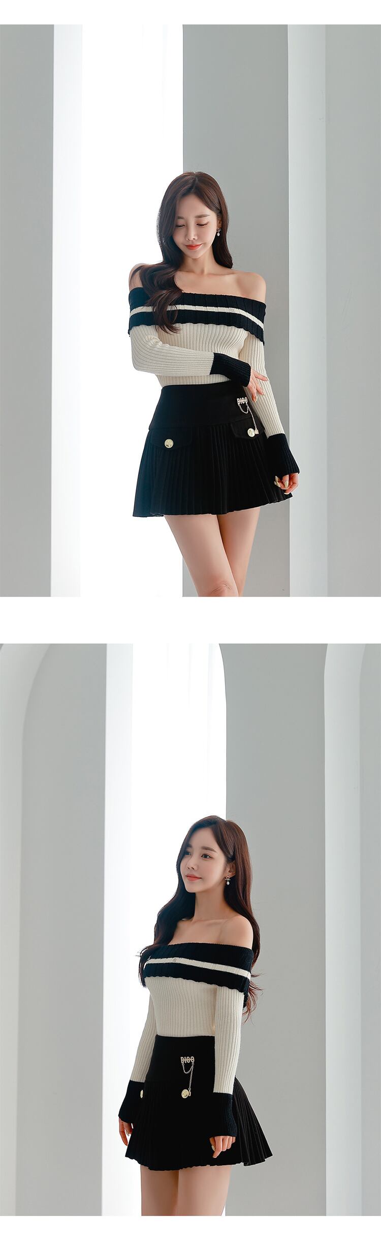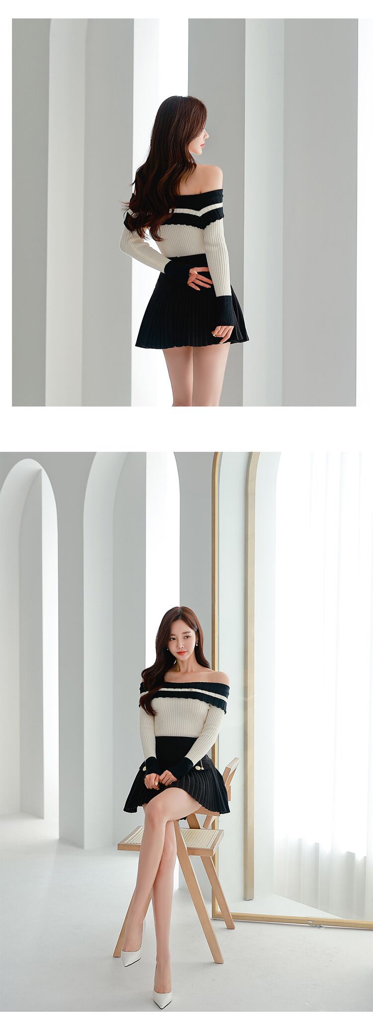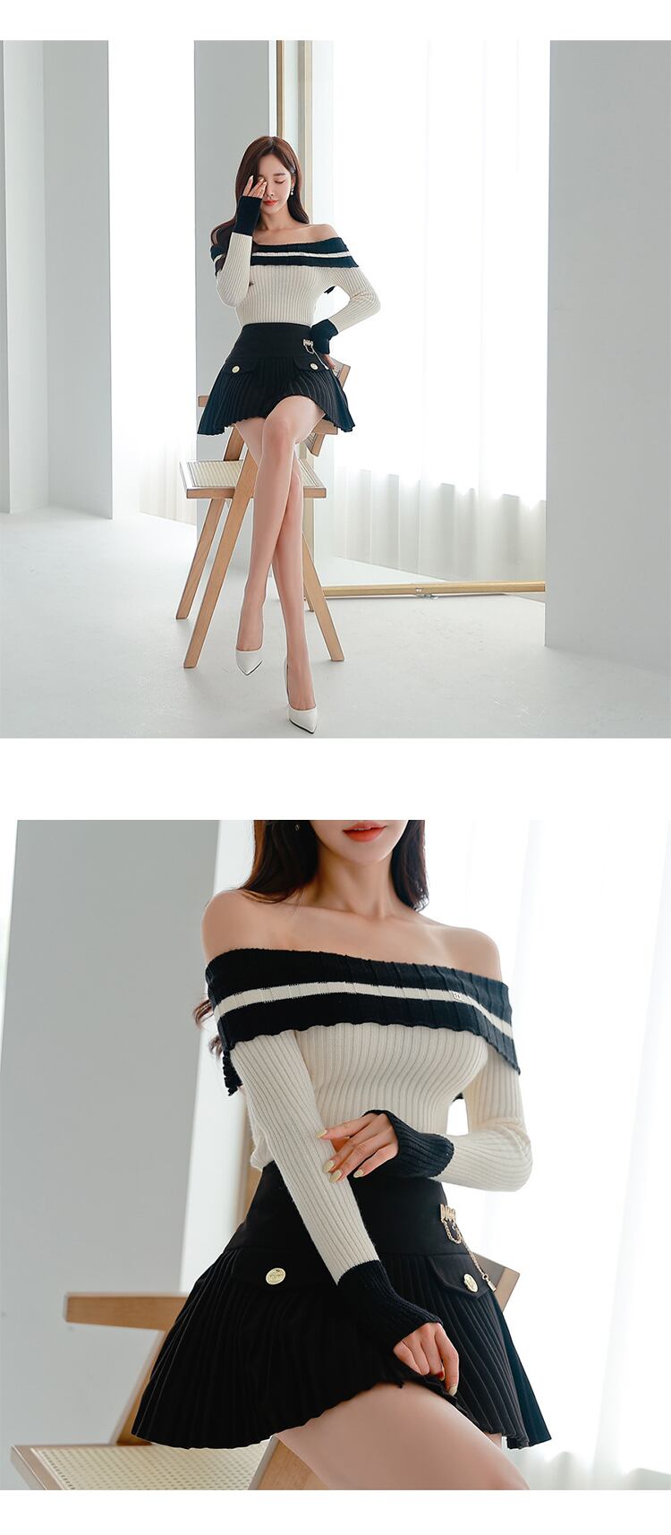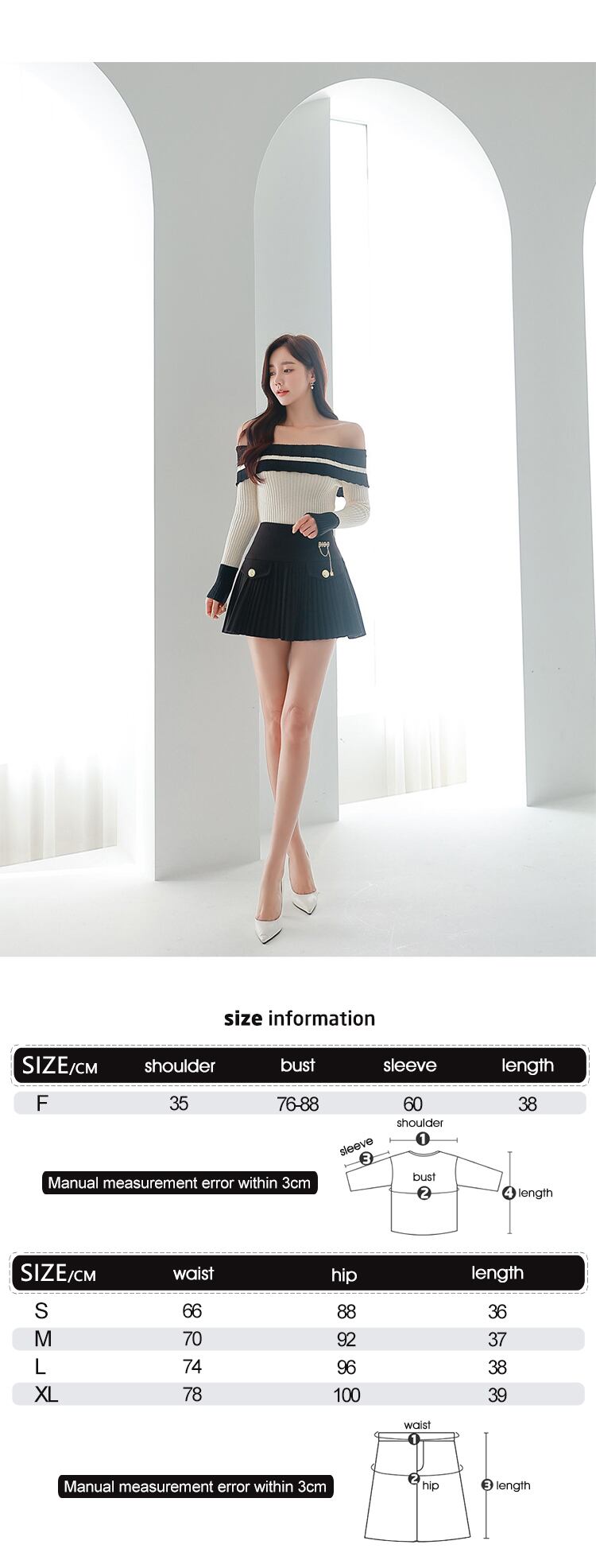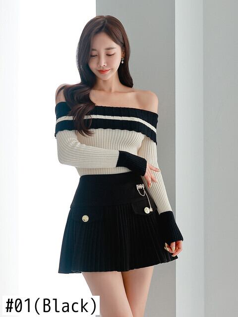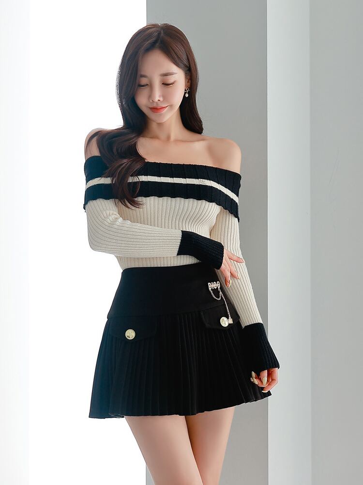 Mode y2k Dame 2 Stück Outfit Frauen Kleidung Strick プルオーバー セクシー シュルター フライ Oberteile und plissierte kurze Minirock Slim Set スリム